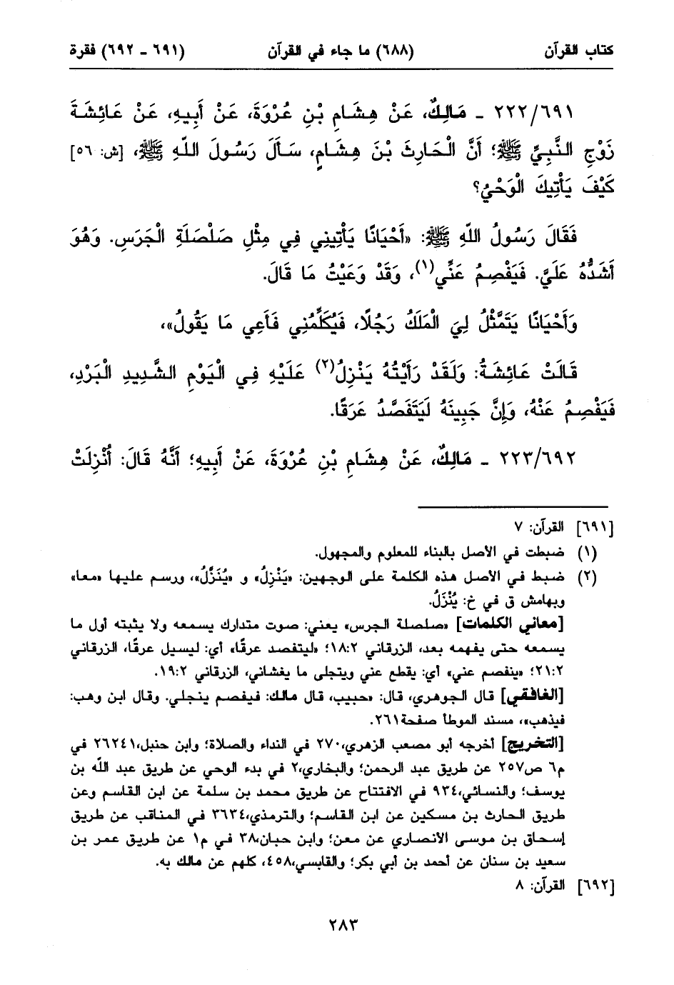 ٦٩١/ ٢٢٢ - مَالِكٌ، عَنْ هِشَامِ بْنِ عُرْوَةَ، عَنْ أَبِيهِ، عَنْ عَائِشَةَ زَوْجِ النَّبِيِّ صلى الله عليه وسلم؛ أَنَّ الْحَارِثَ بْنَ هِشَامٍ، سَأَلَ رَسُولَ اللهِ صلى الله عليه وسلم، [ش: ٥٦] كَيْفَ يَأْتِيكَ الْوَحْيُ؟