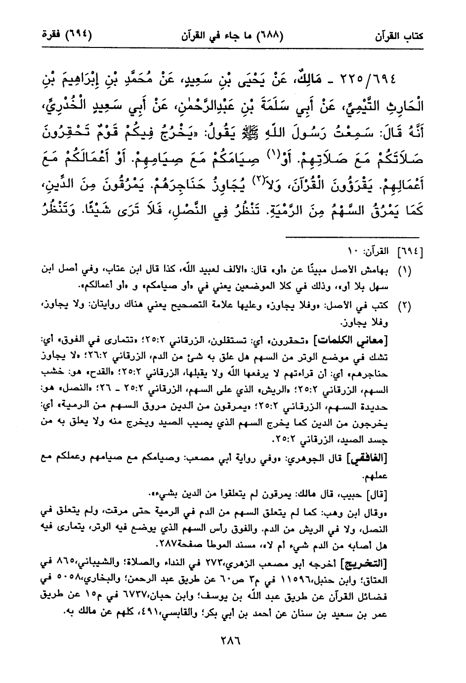 ٦٩٤/ ٢٢٥ - مَالِكٌ، عَنْ يَحْيَى بْنِ سَعِيدٍ، عَنْ مُحَمَّدِ بْنِ إِبْرَاهِيمَ بْنِ الْحَارِثِ التَّيْمِيِّ، عَنْ أَبِي سَلَمَةَ بْنِ عَبْدِ الرَّحْمنِ، عَنْ أَبِي سَعِيدٍ الْخُدْرِيِّ، أَنَّهُ قَالَ: سَمِعْتُ رَسُولَ اللهِ صلى الله عليه وسلم يَقُولُ: «يَخْرُجُ فِيكُمْ قَوْمٌ تَحْقِرُونَ صَلَاتَكُمْ مَعَ صَلَاتِهِمْ. أَوْ (١) صِيَامَكُمْ مَعَ صِيَامِهِمْ. أَوْ أَعْمَالَكُمْ مَعَ أَعْمَالِهِمْ. يَقْرَؤُونَ الْقُرْآنَ، وَلَا (٢) يُجَاوِزُ حَنَاجِرَهُمْ. يَمْرُقُونَ مِنَ الدِّينِ، كَمَا يَمْرُقُ السَّهْمُ مِنَ الرَّمْيَةِ. تَنْظُرُ فِي النَّصْلِ، فَلَا تَرَى شَيْئاً. وَتَنْظُرُ ⦗٢٨٧⦘ فِي الْقِدْحِ، فَلَا تَرَى شَيْئاً. وَتَنْظُرُ فِي الرِّيشِ، فَلَا تَرَى شَيْئاً. وَتَتَمَارَى فِي الْفُوقِ».
