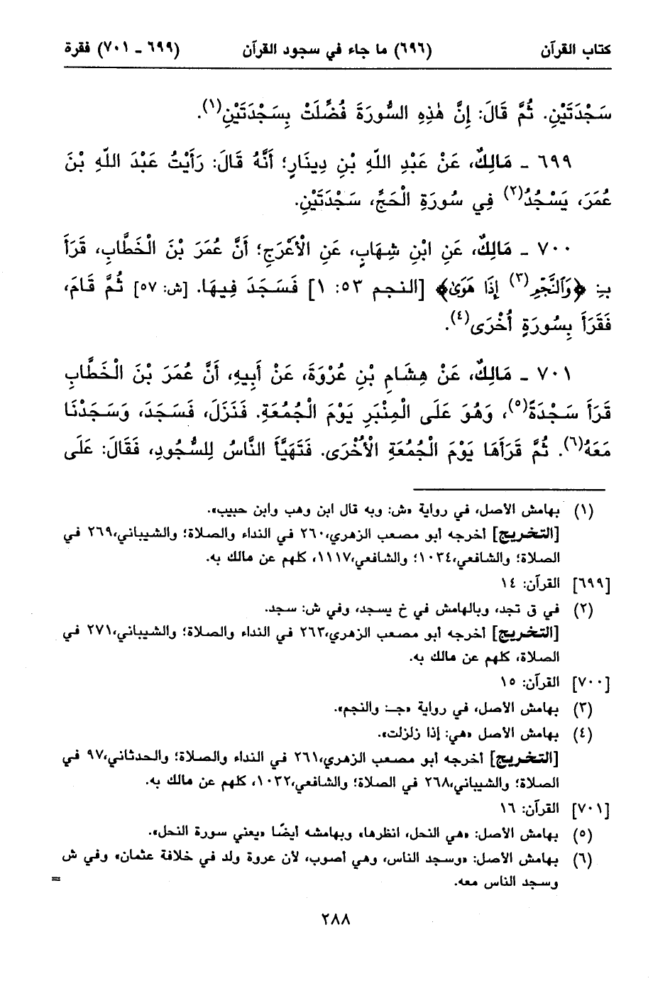٧٠٠ - مَالِكٌ، عَنِ ابْنِ شِهَابٍ، عَنِ الْأَعْرَجِ؛ أَنَّ عُمَرَ بْنَ الْخَطَّابِ، قَرَأَ بِ: {وَالنَّجْمِ (١) إِذا هَوَى} [النجم ٥٣: ١] فَسَجَدَ فِيهَا. [ش: ٥٧] ثُمَّ قَامَ، فَقَرَأَ بِسُورَةٍ أُخْرَى (٢).