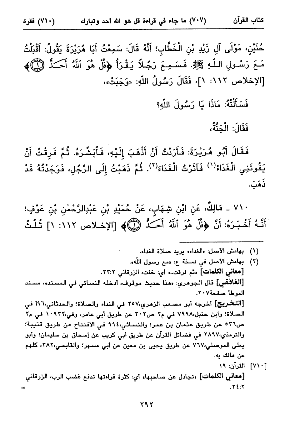 ٧١٠ - مَالِكٌ، عَنِ ابْنِ شِهَابٍ، عَنْ حُمَيْدِ بْنِ عَبْدِ الرَّحْمنِ بْنِ عَوْفٍ؛ أَنَّهُ أَخْبَرَهُ: أَنَّ {قُلْ هُوَ اللهُ أَحَدُ} [الإخلاص ١١٢: ١] ثُلُثُ ⦗٢٩٣⦘ الْقُرْآنِ. وَأَنَّ {تَبَارَكَ الَّذِي بِيَدِهِ المُلْكُ} [الملك ٦٧: ١] تُجَادِلُ عَنْ صَاحِبِهَا.