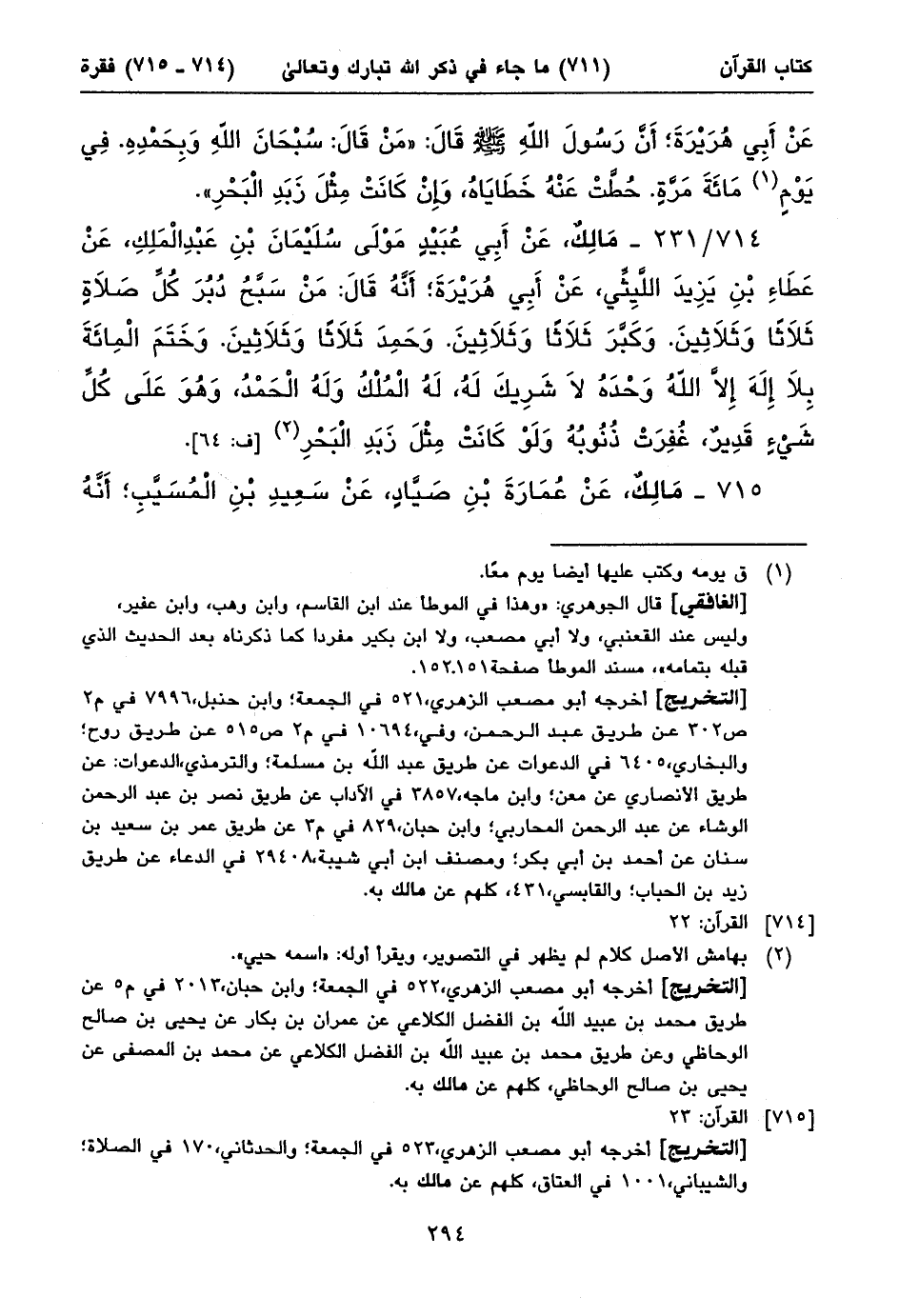 ٧١٥ - مَالِكٌ، عَنْ عُمَارَةَ بْنِ صَيَّادٍ، عَنْ سَعِيدِ بْنِ الْمُسَيَّبِ؛ أَنَّهُ ⦗٢٩٥⦘ سَمِعَهُ يَقُولُ، فِي الْبَاقِيَاتِ الصَّالِحَاتِ: أَنَّهَا قَوْلُ الْعَبْدِ: اللهُ أَكْبَرُ. وَسُبْحَانَاللهِ. وَالْحَمْدُ للهِ. وَلَا إِلَهَ إِلَاّ اللهُ. وَلَا حَوْلَ وَلَا قُوَّةَ إِلَاّ بِاللهِ.