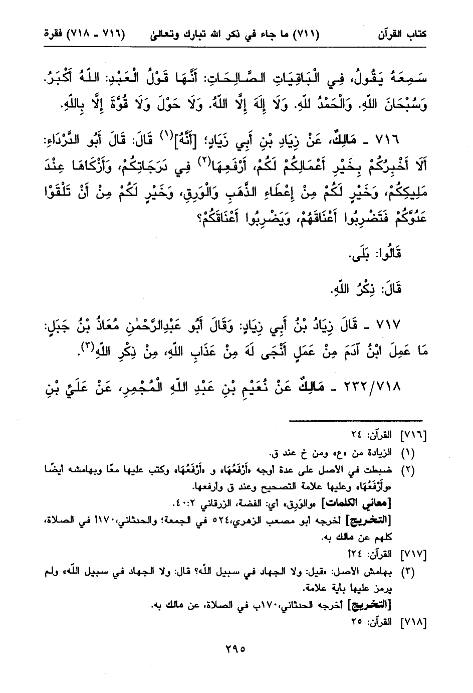 ٧١٧ - قَالَ زِيَادُ بْنُ أَبِي زِيَادٍ: وَقَالَ أَبُو عَبْدِ الرَّحْمنِ مُعَاذُ بْنُ جَبَلٍ: مَا عَمِلَ ابْنُ آدَمَ مِنْ عَمَلٍ أَنْجَى لَهَ مِنْ عَذَابِ اللهِ، مِنْ ذِكْرِ اللهِ (١).