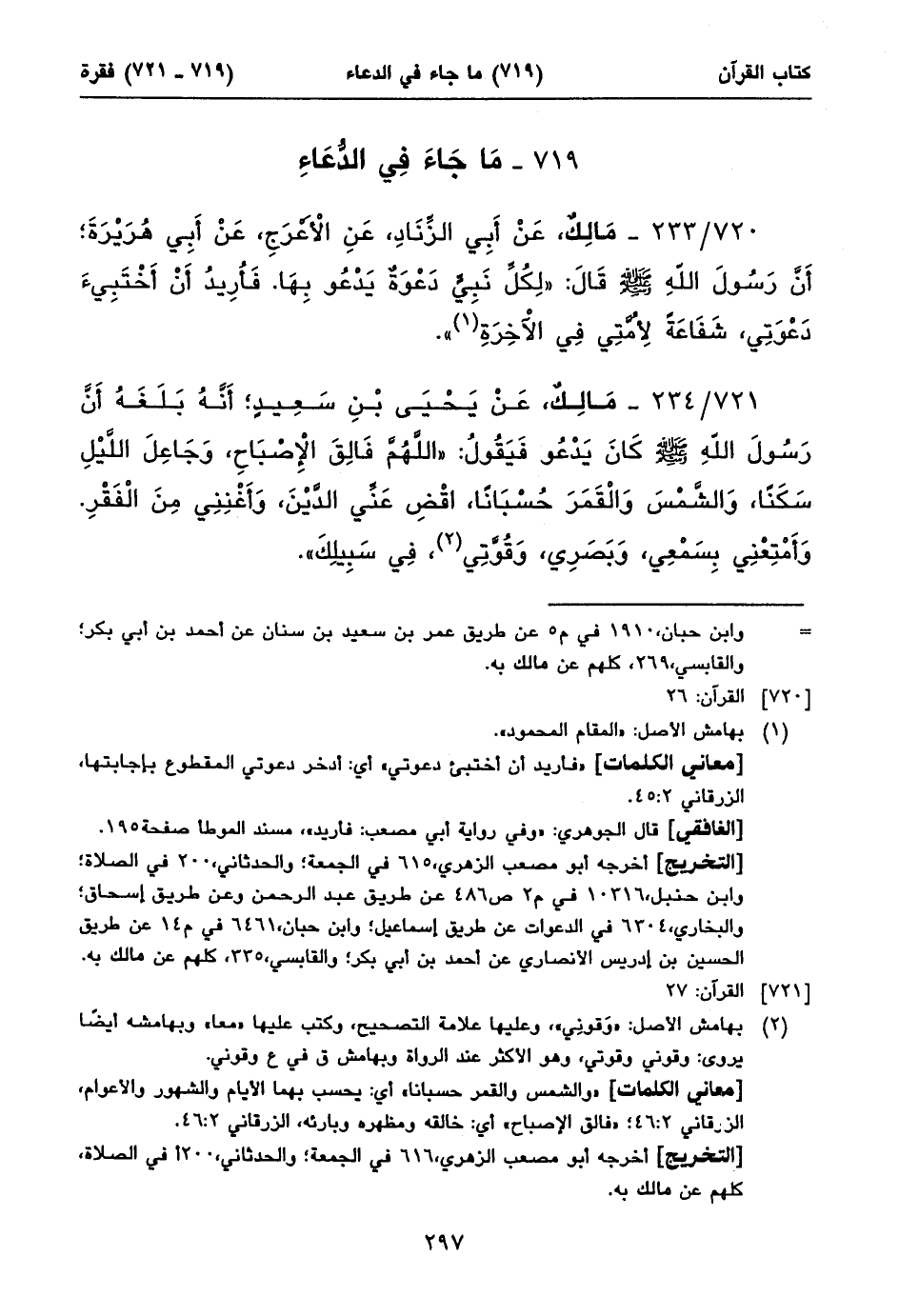 ٧٢١/ ٢٣٤ - مَالِكٌ، عَنْ يَحْيَى بْنِ سَعِيدٍ؛ أَنَّهُ بَلَغَهُ أَنَّ رَسُولَ اللهِ صلى الله عليه وسلم كَانَ يَدْعُو فَيَقُولُ: «اللَّهُمَّ فَالِقَ الْإِصْبَاحِ، وَجَاعِلَ اللَّيْلِ سَكَناً، وَالشَّمْسَ وَالْقَمَرَ حُسْبَاناً، اقْضِ عَنِّي الدَّيْنَ، وَأَغْنِنِي مِنَ الْفَقْرِ. وَأَمْتِعْنِي بِسَمْعِي، وَبَصَرِي، وَقُوَّتِي (١)، فِي سَبِيلِكَ».