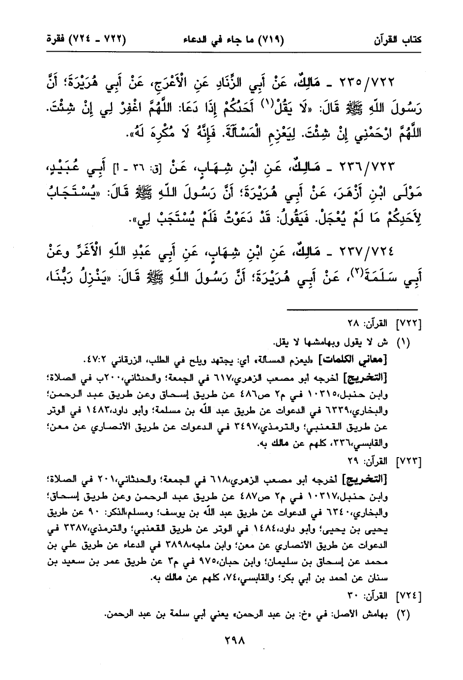 ٧٢٣/ ٢٣٦ - مَالِكٌ، عَنِ ابْنِ شِهَابٍ، عَنْ [ق: ٣٦ - أ] أَبِي عُبَيْدٍ، مَوْلَى ابْنِ أَزْهَرَ، عَنْ أَبِي هُرَيْرَةَ؛ أَنَّ رَسُولَ اللهِ صلى الله عليه وسلم قَالَ: «يُسْتَجَابُ لِأَحَدِكُمْ مَا لَمْ يُعْجَلْ. فَيَقُولُ: قَدْ دَعَوْتُ فَلَمْ يُسْتَجَبْ لِي».