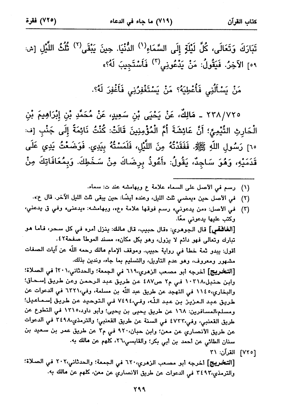 ٧٢٥/ ٢٣٨ - مَالِكٌ، عَنْ يَحْيَى بْنِ سَعِيدٍ، عَنْ مُحَمَّدِ بْنِ إِبْرَاهِيمَ بْنِ الْحَارِثِ التَّيْمِيِّ؛ أَنَّ عَائِشَةَ أُمَّ الْمُؤْمِنِينَ قَالَتْ: كُنْتُ نَائِمَةً إِلَى جَنْبِ [ف: ٦٥] رَسُولِ اللهِ صلى الله عليه وسلم. فَفَقَدْتُهُ مِنَ اللَّيْلِ، فَلَمَسْتُهُ بِيَدِي. فَوَضَعْتُ يَدِي عَلَى قَدَمَيْهِ، وَهُوَ سَاجِدٌ، يَقُولُ: «أَعُوذُ بِرِضَاكَ مِنْ سَخَطِكَ. وَبِمُعَافَاتِكَ مِنْ ⦗٣٠٠⦘ عُقُوبَتِكَ. وَبِكَ مِنْكَ. لَا أُحْصِي ثَنَاءً عَلَيْكَ. أَنْتَ كَمَا أَثْنَيْتَ عَلَى نَفْسِكَ».