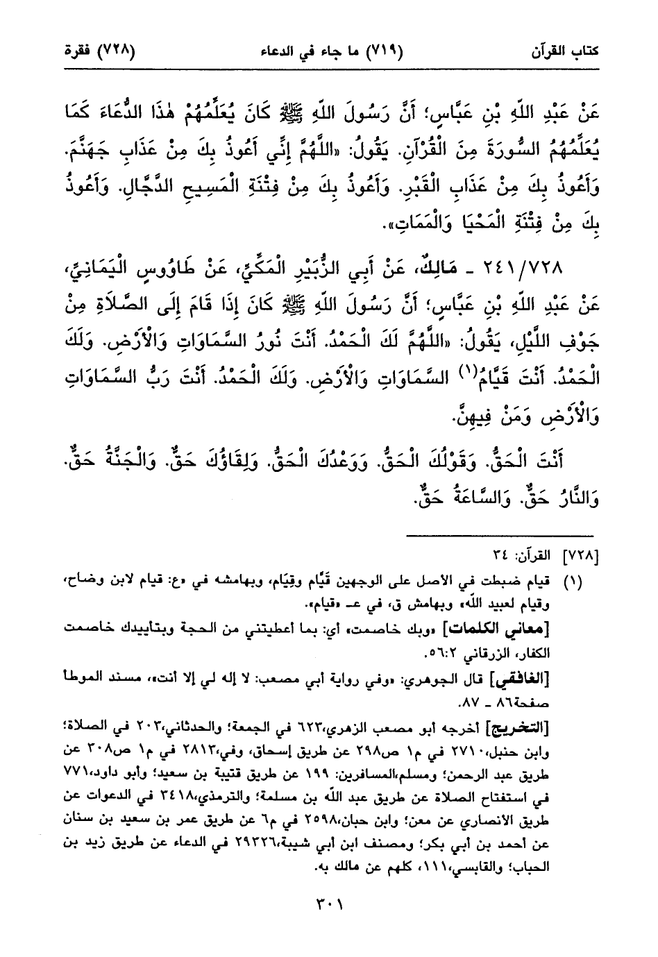 أخرجه أبو مصعب الزهري، ٦٢٣ في الجمعة؛ والحدثاني، ٢٠٣ في الصلاة؛ وابن حنبل، ٢٧١٠ في م١ ص٢٩٨ عن طريق إسحاق، وفي، ٢٨١٣ في م١ ص٣٠٨ عن طريق عبد الرحمن؛ ومسلم، المسافرين: ١٩٩ عن طريق قتيبة بن سعيد؛ وأبو داود، ٧٧١ في استفتاح الصلاة عن طريق عبد الله بن مسلمة؛ والترمذي، ٣٤١٨ في الدعوات عن طريق الأنصاري عن معن؛ وابن حبان، ٢٥٩٨ في م٦ عن طريق عمر بن سعيد بن سنان عن أحمد بن أبي بكر؛ ومصنف ابن أبي شيبة، ٢٩٣٢٦ في الدعاء عن طريق زيد بن الحباب؛ والقابسي، ١١١، كلهم عن مالك به.