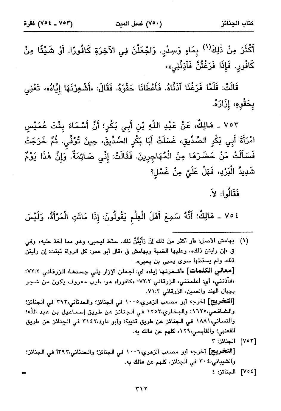 ٧٥٣ - مَالِكٌ، عَنْ عَبْدِ اللهِ بْنِ أَبِي بَكْرٍ؛ أَنَّ أَسْمَاءَ بِنْتَ عُمَيْسٍ امْرَأَةَ أَبِي بَكْرٍ الصِّدِّيقِ، غَسَلَتْ أَبَا بَكْرٍ الصِّدِّيقَ، حِينَ تُوُفِّيِ. ثُمَّ خَرَجَتْ فَسَأَلَتْ مَنْ حَضَرَهَا مِنَ الْمُهَاجِرِينَ. فَقَالَتْ: إِنِّي صَائِمَةٌ. وَإِنَّ هذَا يَوْمٌ شَدِيدُ الْبَرْدِ، فَهَلْ عَلَيَّ مِنْ غَسْلٍ؟
