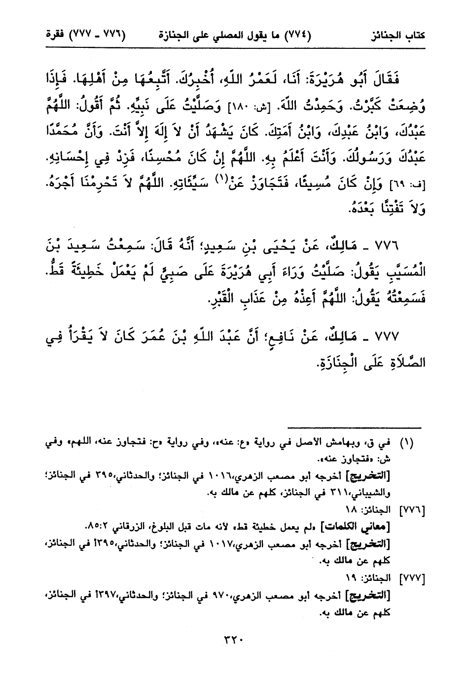 ٧٧٧ - مَالِكٌ، عَنْ نَافِعٍ؛ أَنَّ عَبْدَ اللهِ بْنَ عُمَرَ كَانَ لَا يَقْرَأُ فِي الصَّلَاةِ عَلَى الْجِنَازَةِ.