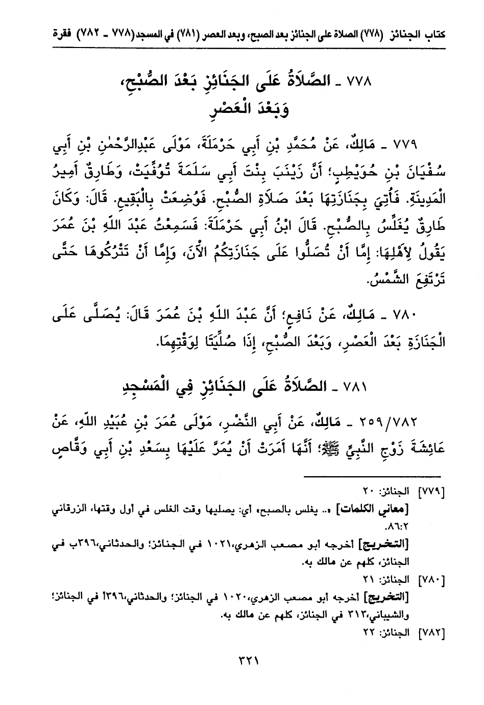 ٧٨٠ - مَالِكٌ، عَنْ نَافِعٍ؛ أَنَّ عَبْدَ اللهِ بْنَ عُمَرَ قَالَ: يُصَلَّى عَلَى الْجَنَازَةِ بَعْدَ الْعَصْرِ، وَبَعْدَ الصُّبْحِ، إِذَا صُلِّيَتَا لِوَقْتِهِمَا.