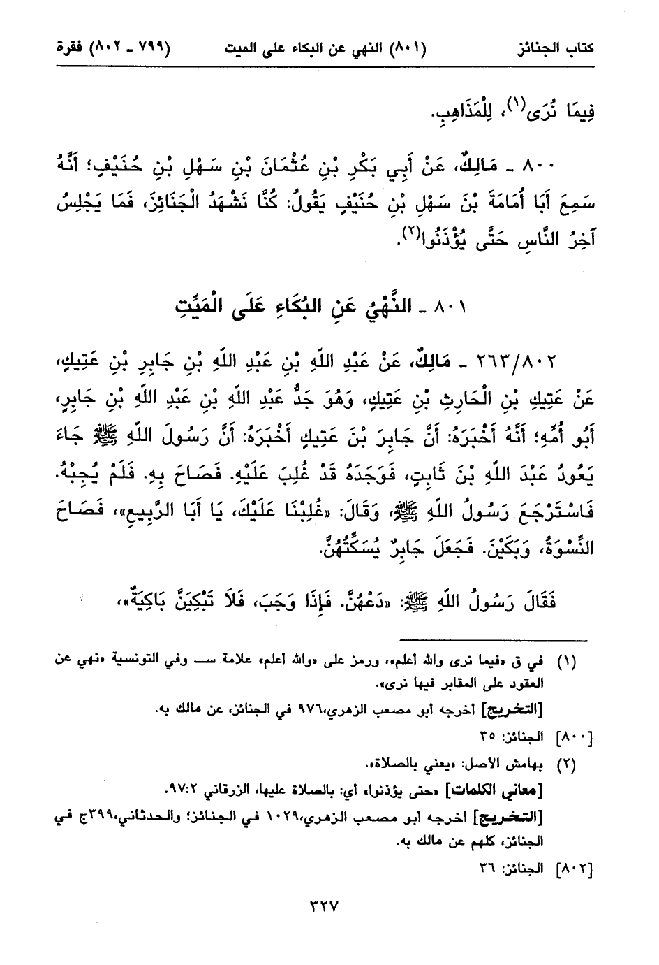 ٨٠٢/ ٢٦٣ - مَالِكٌ، عَنْ عَبْدِ اللهِ بْنِ عَبْدِ اللهِ بْنِ جَابِرِ بْنِ عَتِيكٍ، عَنْ عَتِيكِ بْنِ الْحَارِثِ بْنِ عَتِيكٍ، وَهُوَ جَدُّ عَبْدِ اللهِ بْنِ عَبْدِ اللهِ بْنِ جَابِرٍ، أَبُو أُمِّهِ؛ أَنَّهُ أَخْبَرَهُ: أَنَّ جَابِرَ بْنَ عَتِيكٍ أَخْبَرَهُ: أَنَّ رَسُولَ اللهِ صلى الله عليه وسلم جَاءَ يَعُودُ عَبْدَ اللهِ بْنَ ثَابِتٍ، فَوَجَدَهُ قَدْ غُلِبَ عَلَيْهِ. فَصَاحَ بِهِ. فَلَمْ يُجِبْهُ. فَاسْتَرْجَعَ رَسُولُ اللهِ صلى الله عليه وسلم، وَقَالَ: «غُلِبْنَا عَلَيْكَ، يَا أَبَا الرَّبِيعِ»، فَصَاحَ النِّسْوَةُ، وَبَكَيْنَ. فَجَعَلَ جَابِرٌ يُسَكِّتُهُنَّ.