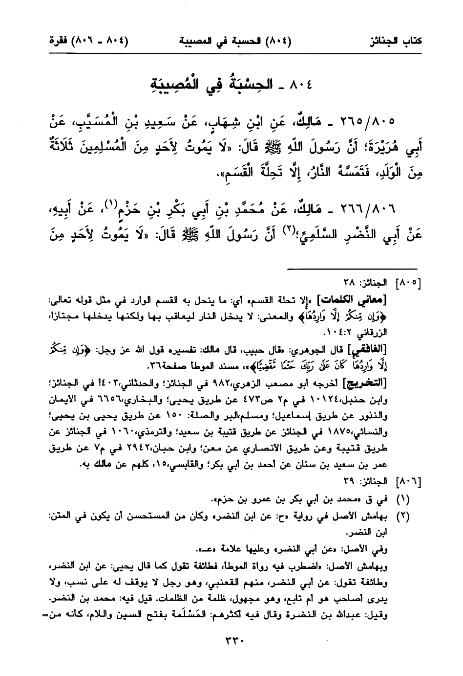 ٨٠٦/ ٢٦٦ - مَالِكٌ، عَنْ مُحَمَّدِ بْنِ أَبِي بَكْرِ بْنِ حَزْمٍ (١)، عَنْ أَبِيهِ، عَنْ أَبِي النَّضْرِ السَّلَمِيِّ؛ (٢) أَنَّ رَسُولَ اللهِ صلى الله عليه وسلم قَالَ: «لَا يَمُوتُ لِأَحَدٍ مِنَ ⦗٣٣١⦘ الْمُسْلِمِينَ ثَلَاثَةٌ مِنَ الْوَلَدِ فَيَحْتَسِبُهُمْ، إِلَاّ كَانُوا لَهُ جُنَّةً مِنَ النَّارِ»،