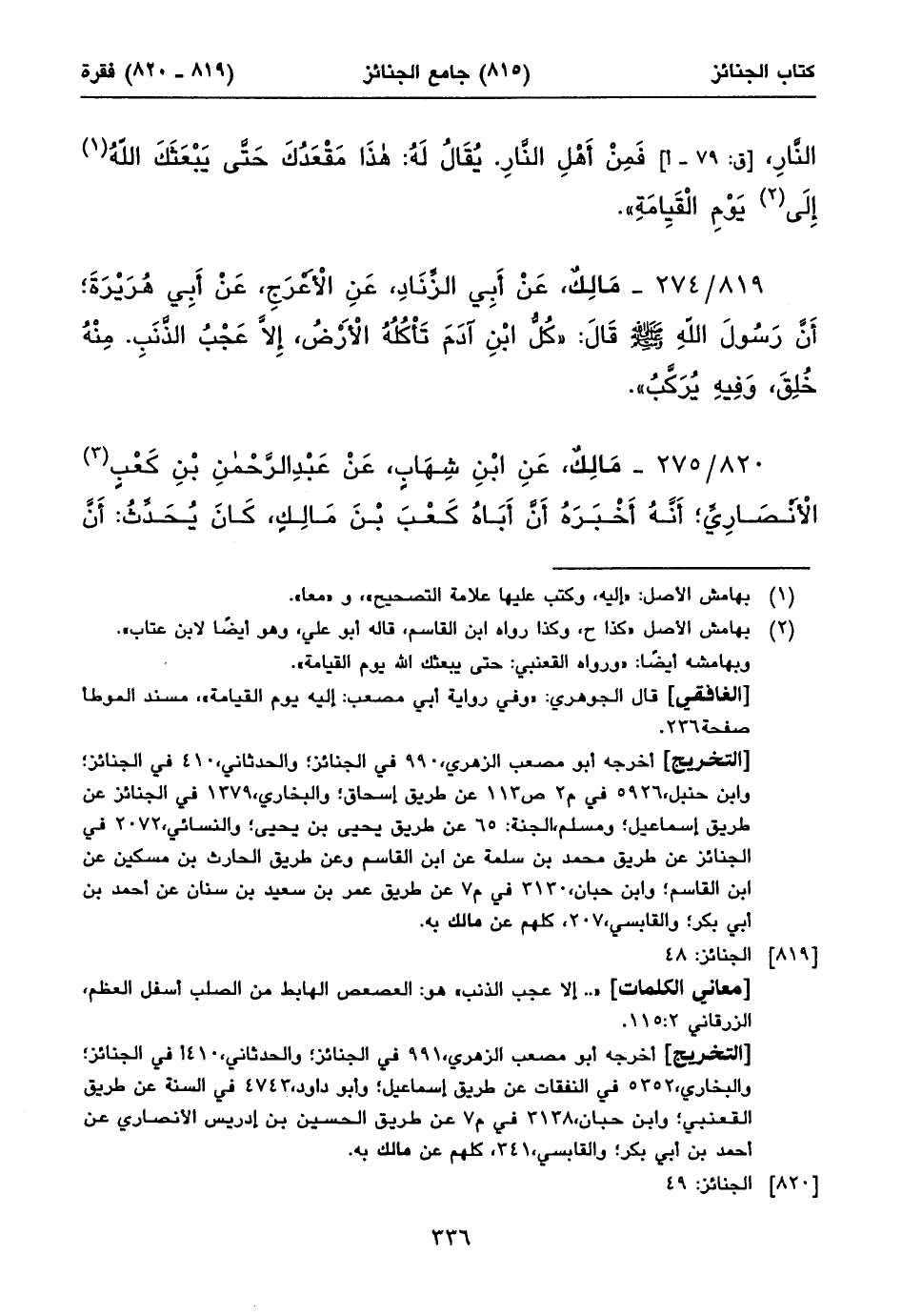 ٨١٩/ ٢٧٤ - مَالِكٌ، عَنْ أَبِي الزِّنَادِ، عَنِ الْأَعْرَجِ، عَنْ أَبِي هُرَيْرَةَ؛ أَنَّ رَسُولَ اللهِ صلى الله عليه وسلم قَالَ: «كُلُّ ابْنِ آدَمَ تَأْكُلُهُ الْأَرْضُ، إِلَاّ عَجْبُ الذَّنَبِ. مِنْهُ خُلِقَ، وَفِيهِ يُرَكَّبُ».