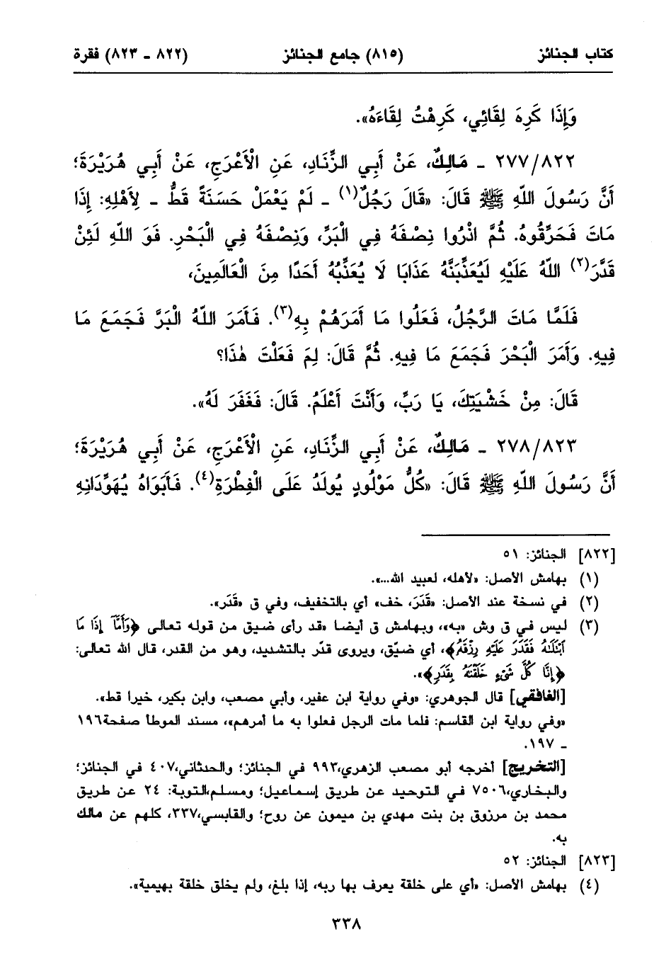 ٨٢٢/ ٢٧٧ - مَالِكٌ، عَنْ أَبِي الزِّنَادِ، عَنِ الْأَعْرَجِ، عَنْ أَبِي هُرَيْرَةَ؛ أَنَّ رَسُولَ اللهِ صلى الله عليه وسلم قَالَ: «قَالَ رَجُلٌ (١) - لَمْ يَعْمَلْ حَسَنَةً قَطُّ - لِأَهْلِهِ: إِذَا مَاتَ فَحَرِّقُوهُ. ثُمَّ اذْرُوا نِصْفَهُ فِي الْبَرِّ، وَنِصْفَهُ فِي الْبَحْرِ. فَوَ اللهِ لَئِنْ قَدَّرَ (٢) اللهُ عَلَيْهِ لَيُعَذِّبَنَّهُ عَذَابَا لَا يُعَذِّبُهُ أَحَداً مِنَ الْعَالَمِينَ،