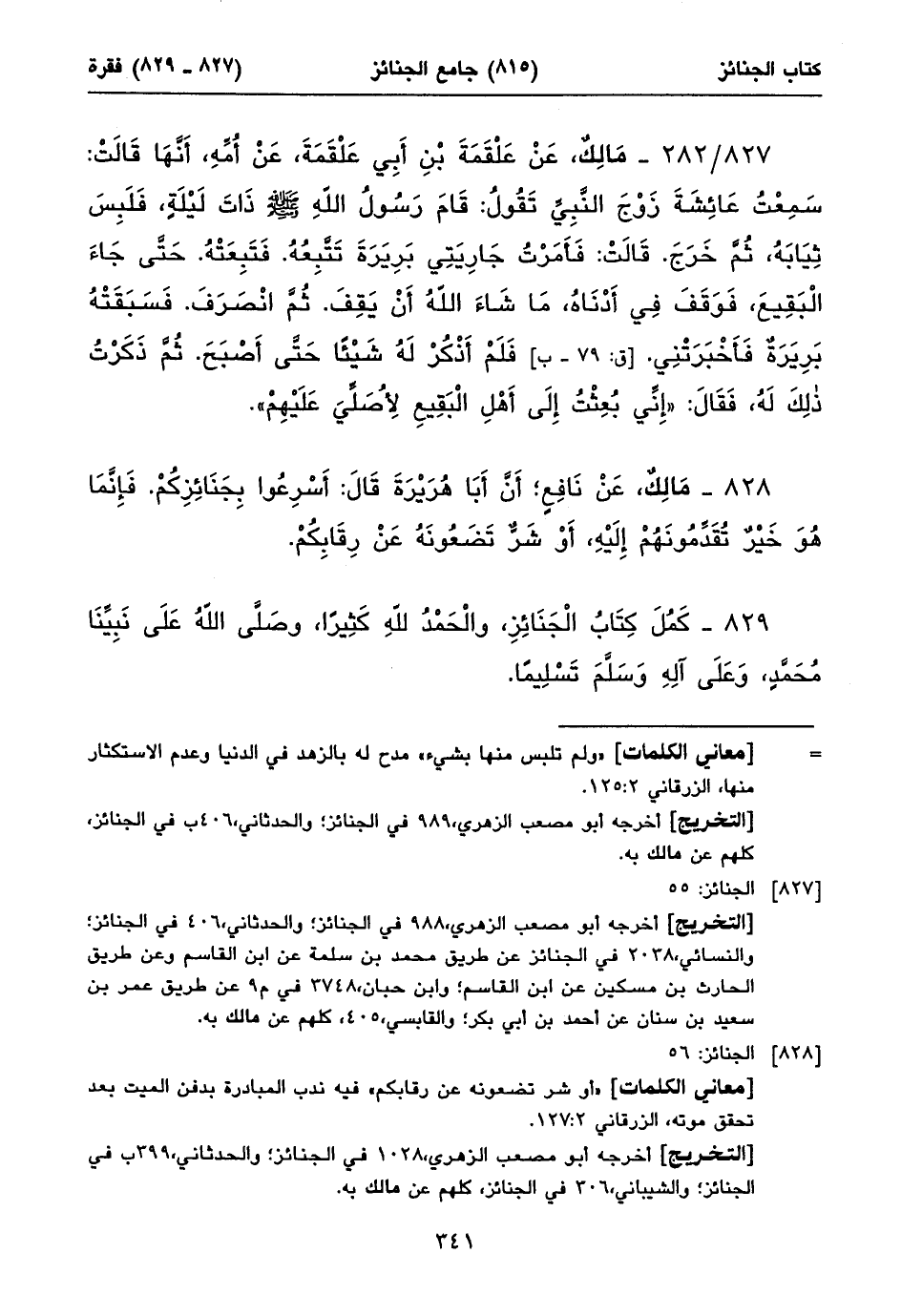 ٨٢٩ - كَمُلَ كِتَابُ الْجَنَائِزِ، والْحَمْدُ للهِ كَثِيراً، وصَلَّى اللهُ عَلَى نَبِيِّنَا مُحَمَّدٍ، وَعَلَى آلِهِ وَسَلَّمَ تَسْلِيماً.