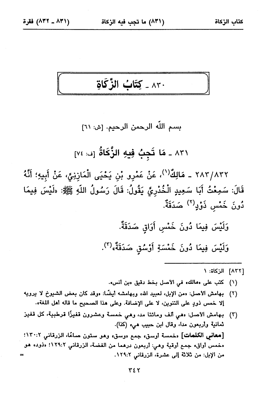 «خمسة أوسق» جمع «وسق» وهو ستون صاعاً، الزرقاني ٢: ١٣٠؛ «خمس أواق» جمع أوقية وهي: أربعون درهما من الفضة، الزرقاني ٢: ١٢٩؛ «ذود» هو من الإبل: من ثلاثة إلى عشرة، الزرقاني ٢: ١٢٩