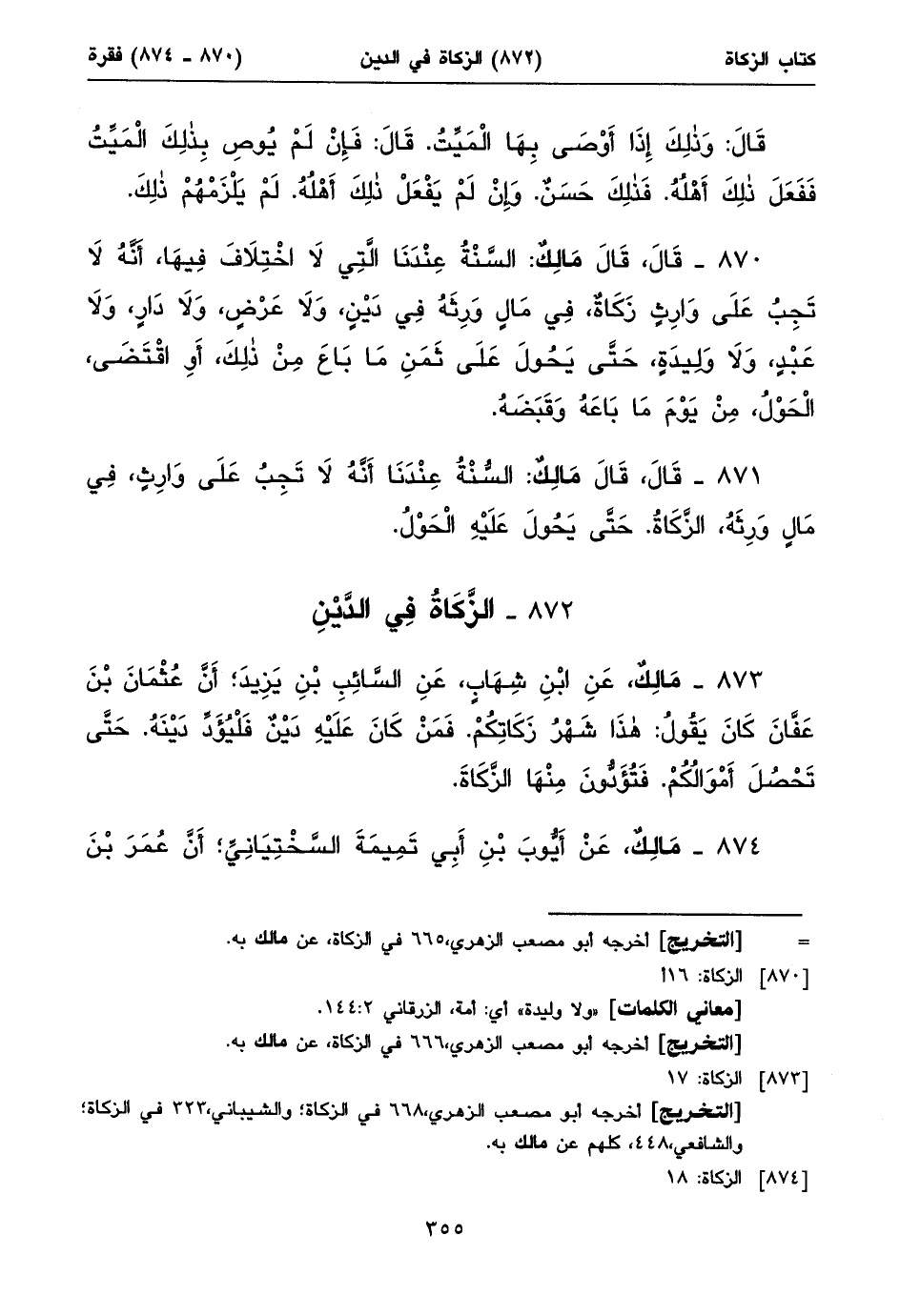 ٨٧٣ - مَالِكٌ، عَنِ ابْنِ شِهَابٍ، عَنِ السَّائِبِ بْنِ يَزِيدَ؛ أَنَّ عُثْمَانَ بْنَ عَفَّانَ كَانَ يَقُولُ: هذَا شَهْرُ زَكَاتِكُمْ. فَمَنْ كَانَ عَلَيْهِ دَيْنٌ فَلْيُؤَدِّ دَيْنَهُ. حَتَّى تَحْصُلَ أَمْوَالُكُمْ. فَتُؤَدُّونَ مِنْهَا الزَّكَاةَ.