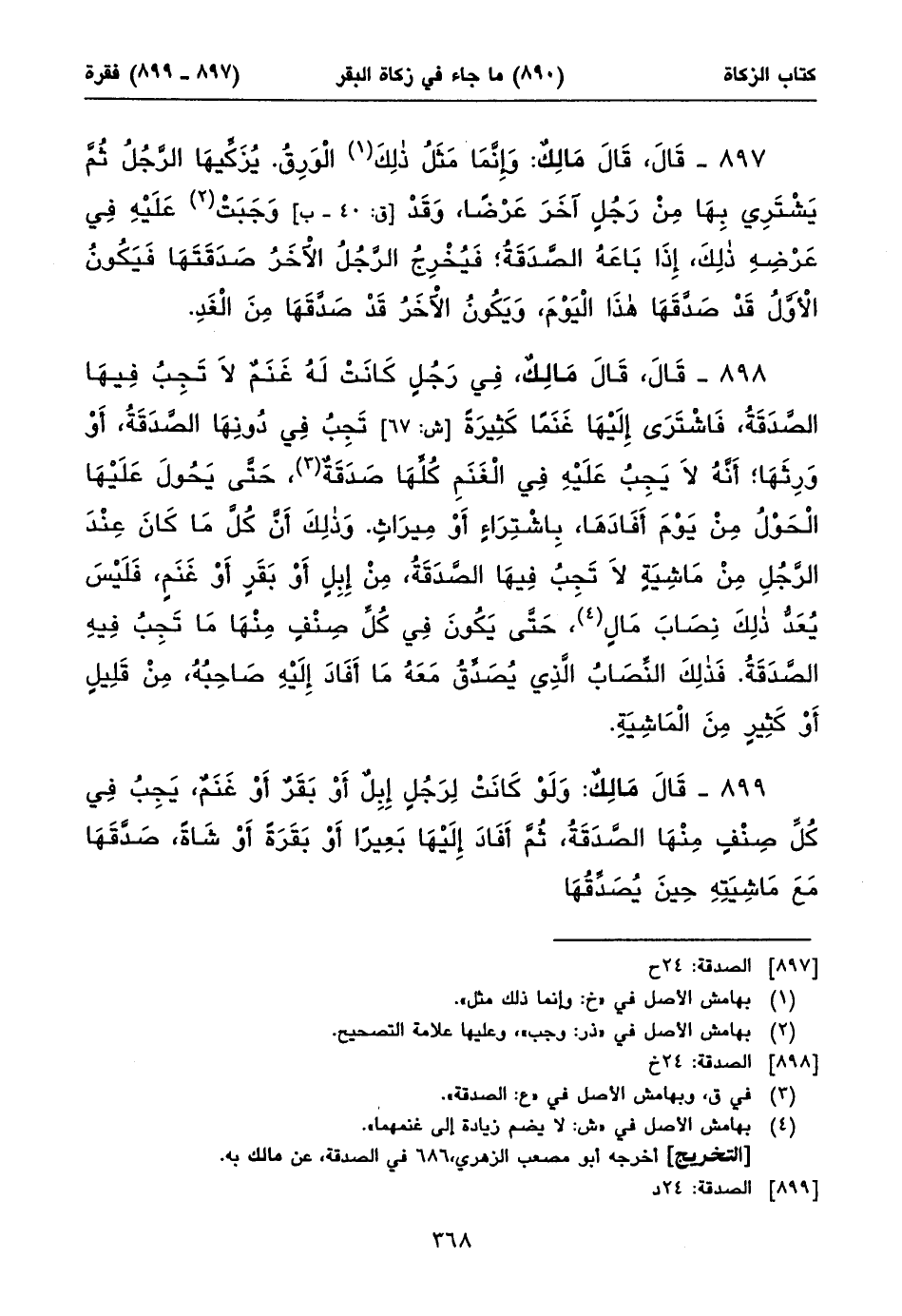 ٨٩٩ - قَالَ مَالِكٌ: وَلَوْ كَانَتْ لِرَجُلٍ إِبِلٌ أَوْ بَقَرٌ أَوْ غَنَمٌ، يَجِبُ فِي كُلِّ صِنْفٍ مِنْهَا الصَّدَقَةُ، ثُمَّ أَفَادَ إِلَيْهَا بَعِيراً أَوْ بَقَرَةً أَوْ شَاةً، صَدَّقَهَا مَعَ مَاشِيَتِهِ حِينَ يُصَدِّقُهَا ⦗٣٦٩⦘