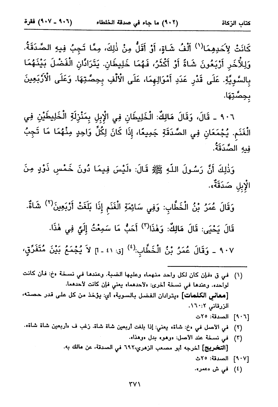 ٩٠٧ - وَقَالَ عُمَرُ بْنُ الْخَطَّابِ: (١) [ق: ٤١ - أ] لَا يُجْمَعُ بَيْنَ مُتَفَرِّقٍ، ⦗٣٧٢⦘ وَلَا يُفَرَّقُ بَيْنَ مُجْتَمِعٍ خَشْيَةَ الصَّدَقَةِ. أَنَّهُ إِنَّمَا يَعْنِي بِذلِكَ أَصْحَابَ الْمَوَاشِي.