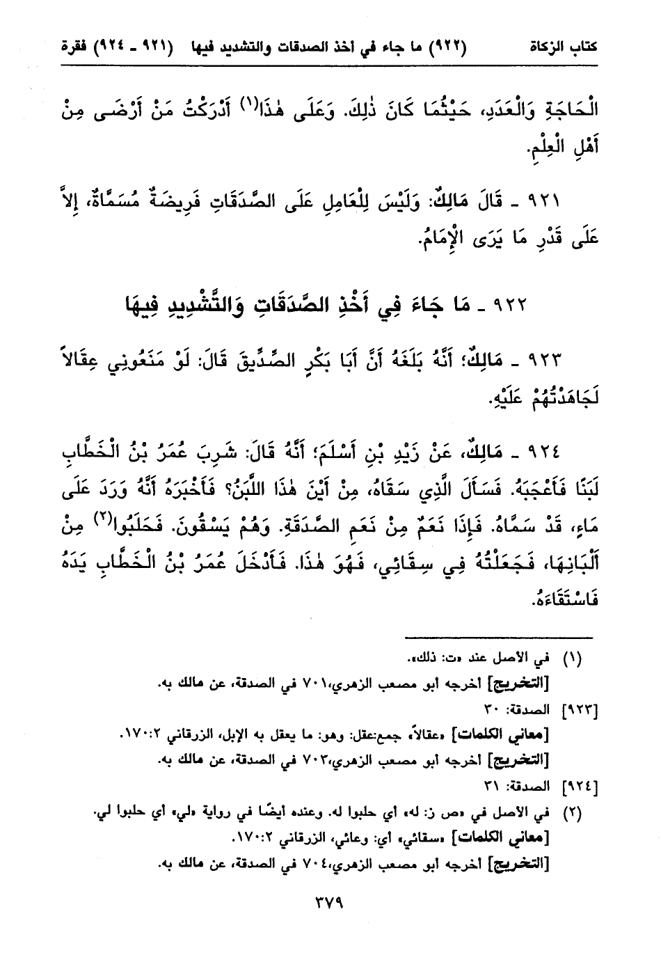 ٩٢٣ - مَالِكٌ؛ أَنَّهُ بَلَغَهُ أَنَّ أَبَا بَكْرٍ الصِّدِّيقَ قَالَ: لَوْ مَنَعُونِي عِقَالاً لَجَاهَدْتُهُمْ عَلَيْهِ.