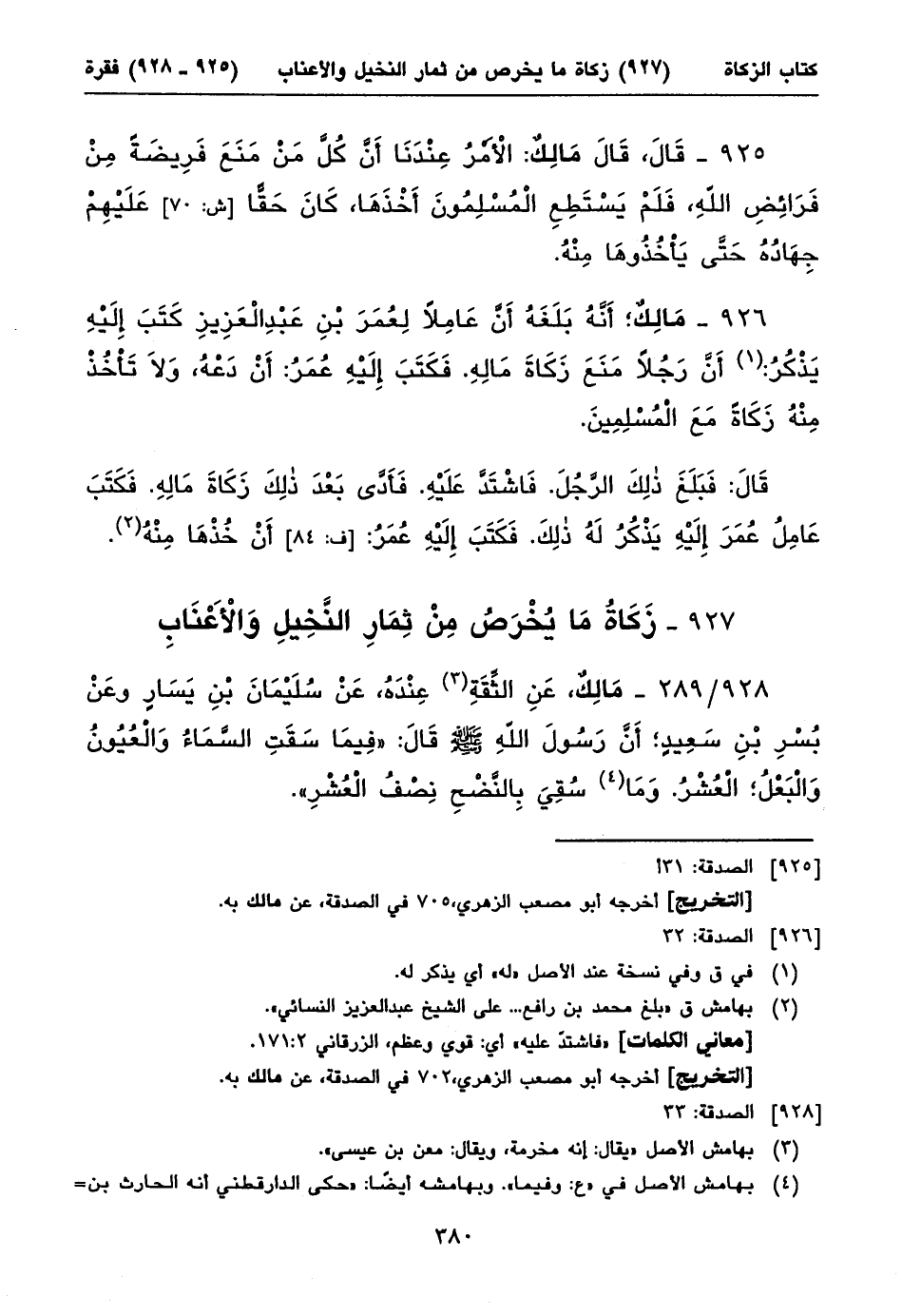 ٩٢٦ - مَالِكٌ؛ أَنَّهُ بَلَغَهُ أَنَّ عَامِلاً لِعُمَرَ بْنِ عَبْدِ الْعَزِيزِ كَتَبَ إِلَيْهِ يَذْكُرُ: (١) أَنَّ رَجُلاً مَنَعَ زَكَاةَ مَالِهِ. فَكَتَبَ إِلَيْهِ عُمَرُ: أَنْ دَعْهُ، وَلَا تَأْخُذْ مِنْهُ زَكَاةً مَعَ الْمُسْلِمِينَ.