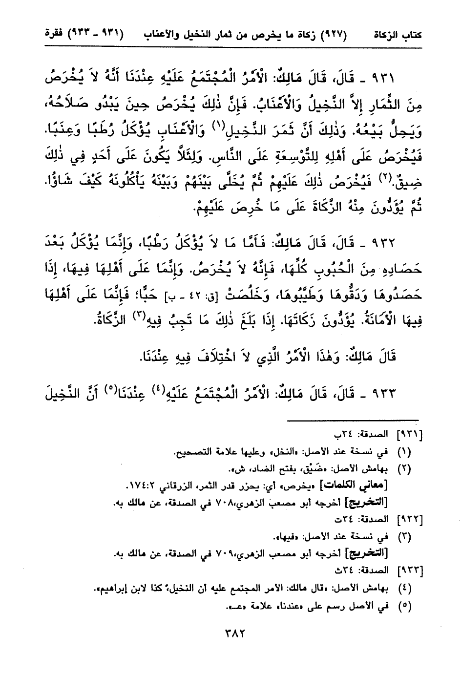 ٩٣٣ - قَالَ، قَالَ مَالِكٌ: الْأَمْرُ الْمُجْتَمَعُ عَلَيْهِ (١) عِنْدَنَا (٢) أَنَّ النَّخِيلَ ⦗٣٨٣⦘ تُخْرَصُ عَلَى أَهْلِهَا. وَثَمَرُهَا فِي رُؤُوسِهَا. إِذَا طَابَ وَحَلَّ بَيْعُهُ. وَيُؤْخَذُ (٣) مِنْهُ صَدَقَتُهُ تَمْراً عِنْدَ الْجِدَادِ.