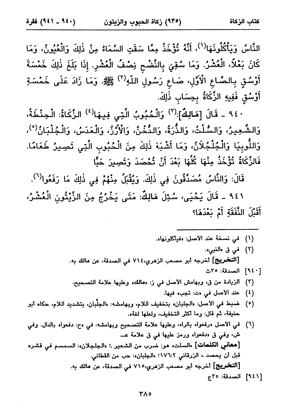٩٤١ - قَالَ يَحْيَى، سُئِلَ مَالِكٌ: مَتَى يَخْرُجُ مِنَ الزَّيْتُونِ الْعُشْرُ، أَقَبْلَ النَّفَقَةِ أَمْ بَعْدَهَا؟ ⦗٣٨٦⦘
