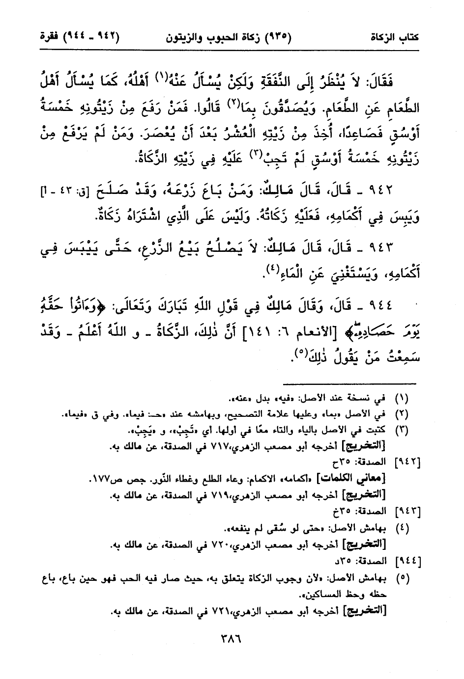 ٩٤٤ - قَالَ، وَقَالَ مَالِكٌ فِي قَوْلِ اللهِ تَبَارَكَ وَتَعَالَى: {وآتُوا حَقَّهُ يَوْمَ حَصَادِهِ} [الأنعام ٦: ١٤١] أَنَّ ذلِكَ، الزَّكَاةُ - واللهُ أَعْلَمُ - وَقَدْ سَمِعْتُ مَنْ يَقُولُ ذلِكَ (١).