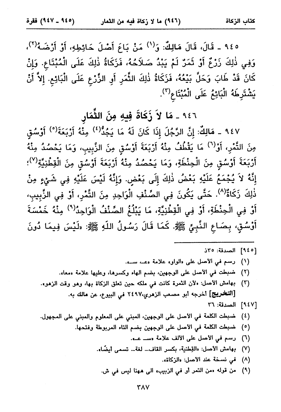 ٩٤٧ - مَالِكٌ: إِنَّ الرَّجُلَ إِذَا كَانَ لَهُ مَا يَجُدُّ (١) مِنْهُ أَرْبَعَةَ (٢) أَوْسُقٍ مِنَ التَّمْرِ، أَوْ (٣) مَا يَقْطُفُ مِنْهُ أَرْبَعَةَ أَوْسُقٍ مِنَ الزَّبِيبِ، وَمَا يَحْصُدُ مِنْهُ أَرْبَعَةَ أَوْسُقٍ مِنَ الْحِنْطَةِ، وَمَا يَحْصُدُ مِنْهُ أَرْبَعَةَ أَوْسُقٍ مِنَ الْقِطْنِيَّةِ (٤)؛ إِنَّهُ لَا يُجْمَعُ عَلَيْهِ بَعْضُ ذلِكَ إِلَى بَعْضٍ. وَإِنَّهُ لَيْسَ عَلَيْهِ فِي شَيْءٍ مِنْ ذلِكَ زَكَاةٌ (٥). حَتَّى يَكُونَ فِي الصِّنْفِ الْوَاحِدِ مِنَ التَّمْرِ، أَوْ فِي الزَّبِيبِ، أَوْفِي الْحِنْطَةِ، أَوْ فِي الْقِطْنِيَّةِ، مَا يَبْلُغُ الصِّنْفُ الْوَاحِدُ (٦) مِنْهُ خَمْسَةَ أَوْسُقٍ، بِصَاعِ النَّبِيِّ صلى الله عليه وسلم. كَمَا قَالَ رَسُولُ اللهِ صلى الله عليه وسلم: «لَيْسَ فِيمَا دُونَ ⦗٣٨٨⦘ خَمْسَةِ أَوْسُقٍ مِنَ التَّمْرِ صَدَقَةٌ».
