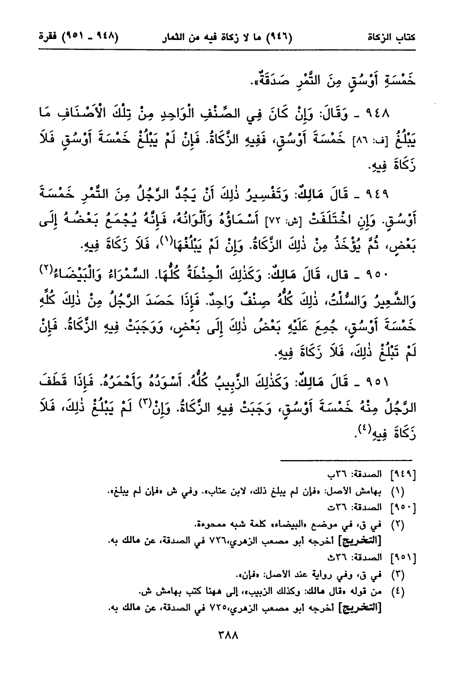 ٩٥١ - قَالَ مَالِكٌ: وَكَذلِكَ الزَّبِيبُ كُلُّهُ. أَسْوَدُهُ وَأَحْمَرُهُ. فَإِذَا قَطَفَ الرَّجُلُ مِنْهُ خَمْسَةَ أَوْسُقٍ، وَجَبَتْ فِيهِ الزَّكَاةُ. وَإِنْ (١) لَمْ يَبْلُغْ ذلِكَ، فَلَا زَكَاةَ فِيهِ (٢).