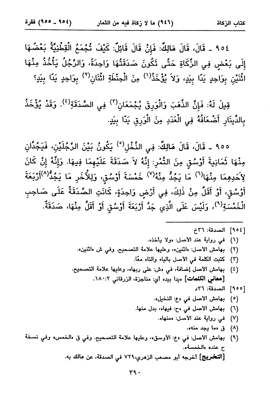 ٩٥٥ - قَالَ، قَالَ مَالِكٌ: فِي النَّخْلِ (١) يَكُونُ بَيْنَ الرَّجُلَيْنِ، فَيَجُدَّانِ مِنْهَا ثَمَانِيةَ أَوْسُقٍ مِنَ التَّمْرِ: إِنَّهُ لَا صَدَقَةَ عَلَيْهِمَا فِيهَا. وَإِنَّهُ إِنْ كَانَ لِأَحَدِهِمَا مِنْهَا (٢) مَا يَجُدُّ مِنْهُ (٣) خَمْسَةَ أَوْسُقٍ، وَلِلْآخَرِ مَا يَجُدُّ (٤) أَرْبَعَةَ أَوْسُقٍ، أَوْ أَقَلَّ مِنْ ذلِكَ، فِي أَرْضٍ وَاحِدَةٍ، كَانَتِ الصَّدَقَةُ عَلَى صَاحِبِ الْخَمْسَةِ (٥)، وَلَيْسَ عَلَى الَّذِي جَدَّ أَرْبَعَةَ أَوْسُقٍ أَوْ أَقَلَّ مِنْهَا، صَدَقَةٌ.