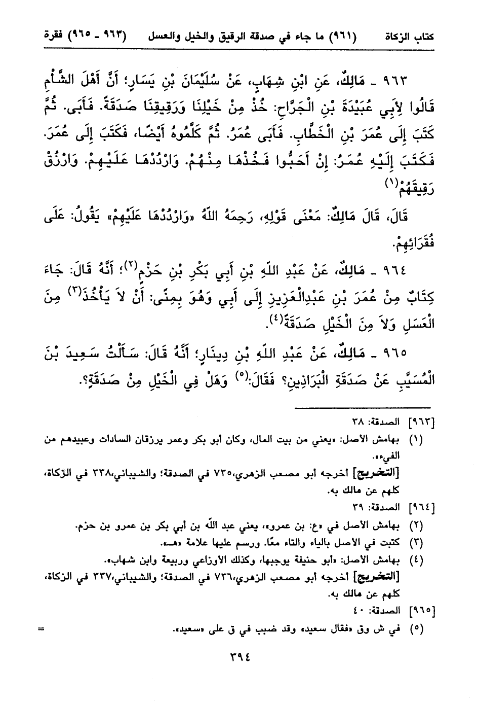 ٩٦٤ - مَالِكٌ، عَنْ عَبْدِ اللهِ بْنِ أَبِي بَكْرِ بْنِ حَزْمٍ (١)؛ أَنَّهُ قَالَ: جَاءَ كِتَابٌ مِنْ عُمَرَ بْنِ عَبْدِ الْعَزِيزِ إِلَى أَبِي وَهُوَ بِمِنًى: أَنْ لَا يَأْخُذَ (٢) مِنَ الْعَسَلِ وَلَا مِنَ الْخَيْلِ صَدَقَةً (٣).