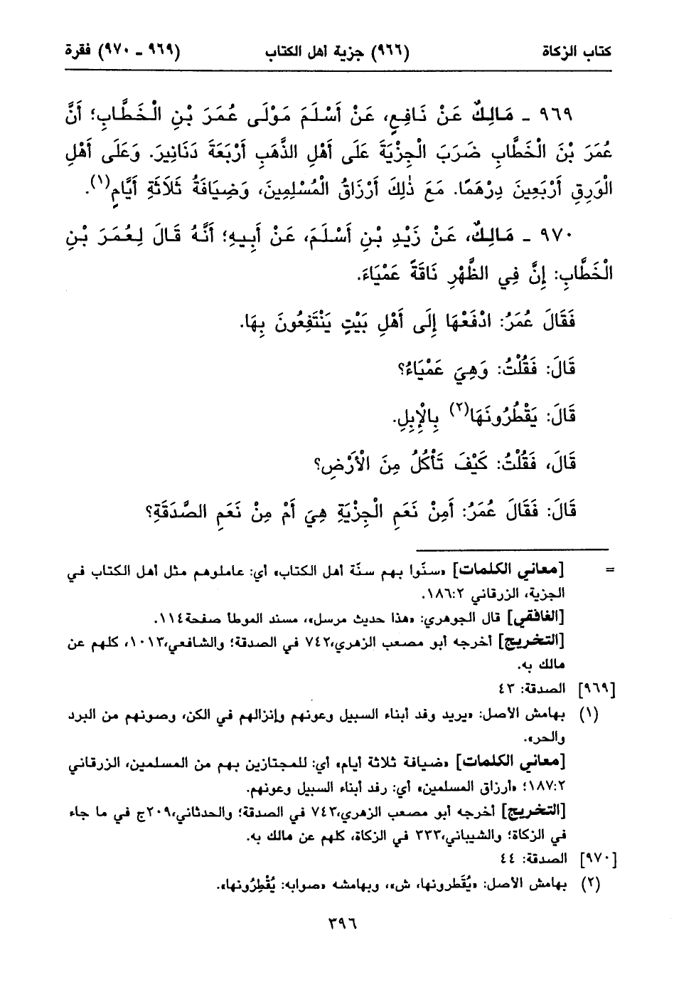 ٩٦٩ - مَالِكٌ عَنْ نَافِعٍ، عَنْ أَسْلَمَ مَوْلَى عُمَرَ بْنِ الْخَطَّابِ؛ أَنَّ عُمَرَ بْنَ الْخَطَّابِ ضَرَبَ الْجِزْيَةَ عَلَى أَهْلِ الذَّهَبِ أَرْبَعَةَ دَنَانِيرَ. وَعَلَى أَهْلِ الْوَرِقِ أَرْبَعِينَ دِرْهَماً. مَعَ ذلِكَ أَرْزَاقُ الْمُسْلِمِينَ، وَضِيَافَةُ ثَلَاثَةِ أَيَّامٍ (١).