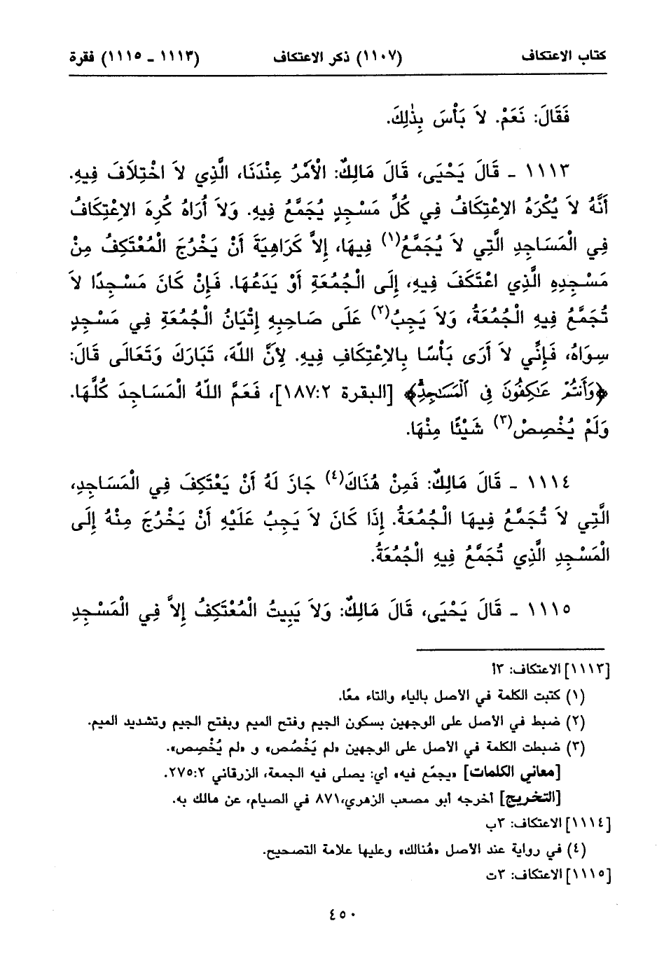 ١١١٣ - قَالَ يَحْيَى، قَالَ مَالِكٌ: الْأَمْرُ عِنْدَنَا، الَّذِي لَا اخْتِلَافَ فِيهِ. أَنَّهُ لَا يُكْرَهُ الِاعْتِكَافُ فِي كُلِّ مَسْجِدٍ يُجَمَّعُ فِيهِ. وَلَا أُرَاهُ كُرِهَ الِاعْتِكَافُ فِي الْمَسَاجِدِ الَّتِي لَا يُجَمَّعُ (١) فِيهَا، إِلَاّ كَرَاهِيَةَ أَنْ يَخْرُجَ الْمُعْتَكِفُ مِنْ مَسْجِدِهِ الَّذِي اعْتَكَفَ فِيهِ، إِلَى الْجُمُعَةِ أَوْ يَدَعُهَا. فَإِنْ كَانَ مَسْجِداً لَا تُجَمَّعُ فِيهِ الْجُمُعَةُ، وَلَا يَجِبُ (٢) عَلَى صَاحِبِهِ إِتْيَانُ الْجُمُعَةِ فِي مَسْجِدٍ سِوَاهُ، فَإِنِّي لَا أَرَى بَأْساً بِالِاعْتِكَافِ فِيهِ. لِأَنَّ اللهَ، تَبَارَكَ وَتَعَالَى قَالَ: {وَأَنْتُمْ عَاكِفُونَ فِي المَسَاجِدِ} [البقرة ٢: ١٨٧]، فَعَمَّ اللهُ الْمَسَاجِدَ كُلَّهَا. وَلَمْ يُخْصِصْ (٣) شَيْئاً مِنْهَا.