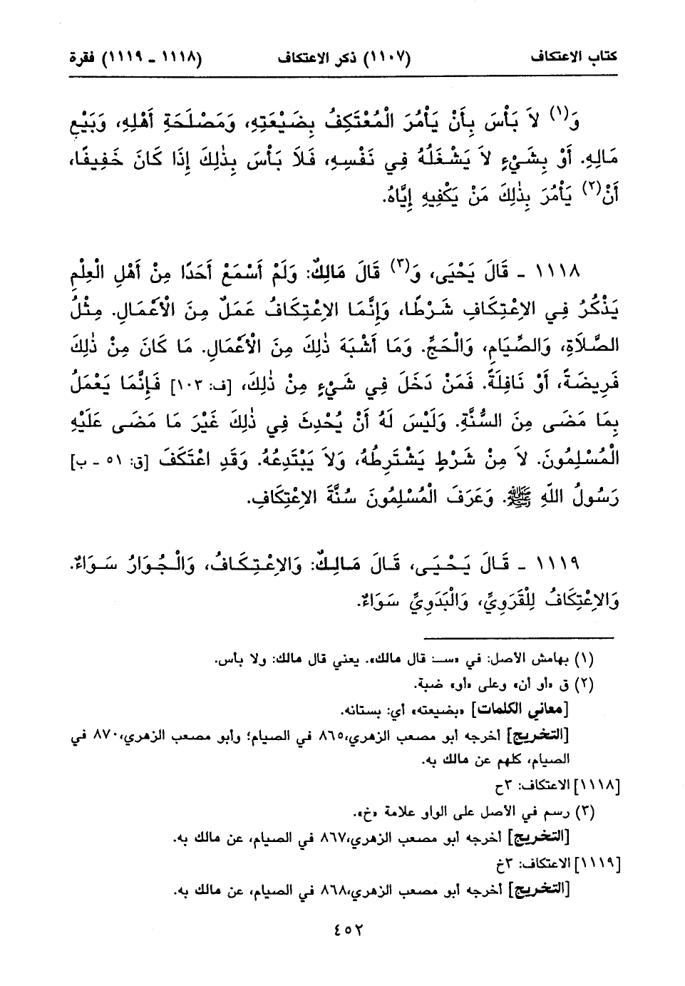 ١١١٨ - قَالَ يَحْيَى، وَ (١) قَالَ مَالِكٌ: وَلَمْ أَسْمَعْ أَحَداً مِنْ أَهْلِ الْعِلْمِ يَذْكُرُ فِي الِاعْتِكَافِ شَرْطاً، وَإِنَّمَا الِاعْتِكَافُ عَمَلٌ مِنَ الْأَعْمَالِ. مِثْلُ الصَّلَاةِ، وَالصِّيَامِ، وَالْحَجِّ. وَمَا أَشْبَهَ ذلِكَ مِنَ الْأَعْمَالِ. مَا كَانَ مِنْ ذلِكَ فَرِيضَةً، أَوْ نَافِلَةً. فَمَنْ دَخَلَ فِي شَيْءٍ مِنْ ذلِكَ، [ف: ١٠٣] فَإِنَّمَا يَعْمَلُ بِمَا مَضَى مِنَ السُّنَّةِ. وَلَيْسَ لَهُ أَنْ يُحْدِثَ فِي ذلِكَ غَيْرَ مَا مَضَى عَلَيْهِ الْمُسْلِمُونَ. لَا مِنْ شَرْطٍ يَشْتَرِطُهُ، وَلَا يَبْتَدِعُهُ. وَقَدِ اعْتَكَفَ [ق: ٥١ - ب] رَسُولُ اللهِ صلى الله عليه وسلم. وَعَرَفَ الْمُسْلِمُونَ سُنَّةَ الِاعْتِكَافِ.
