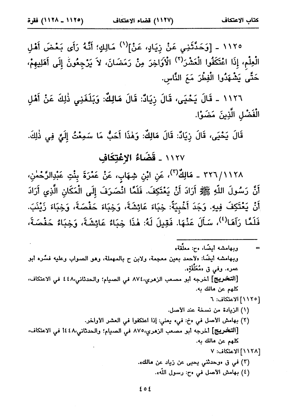 ١١٢٨/ ٣٢٦ - مَالِكٌ (١)، عَنِ ابْنِ شِهَابٍ، عَنْ عَمْرَةَ بِنْتِ عَبْدِ الرَّحْمنِ، أَنَّ رَسُولَ اللهِ صلى الله عليه وسلم أَرَادَ أَنْ يَعْتَكِفَ. فَلَمَّا انْصَرَفَ إِلَى الْمَكَانِ الَّذِي أَرَادَ أَنْ يَعْتَكِفَ فِيهِ. وَجَدَ أَخْبِيَةً: خِبَاءَ عَائِشَةَ، وَخِبَاءَ حَفْصَةَ، وَخِبَاءَ زَيْنَبَ. فَلَمَّا رَآهَا (٢)، سَأَلَ عَنْهَا. فَقِيلَ لَهُ: هذَا خِبَاءُ عَائِشَةَ، وَخِبَاءُ حَفْصَةَ، ⦗٤٥٥⦘ وَخِبَاءُزَيْنَبَ (٣). فَقَالَ رَسُولُ اللهِ صلى الله عليه وسلم: «آلْبِرَّ تَقُولُونَ بِهِنَّ؟» ثُمَّ انْصَرَفَ، فَلَمْ يَعْتَكِفْ. حَتَّى اعْتَكَفَ عَشْراً مِنْ شَوَّالٍ (٤).