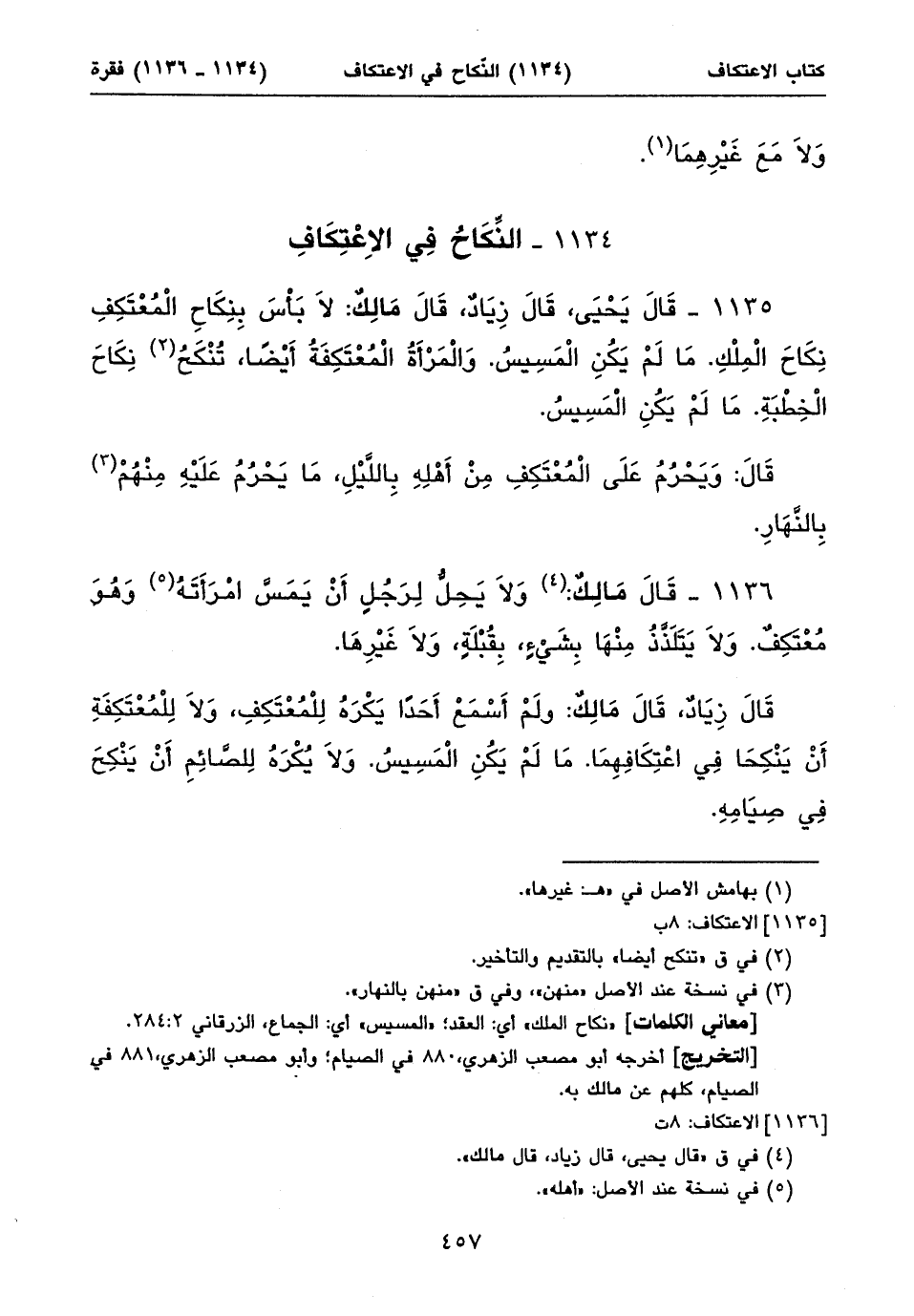 ١١٣٥ - قَالَ يَحْيَى، قَالَ زِيَادٌ، قَالَ مَالِكٌ: لَا بَأْسَ بِنِكَاحِ الْمُعْتَكِفِ نِكَاحَ الْمِلْكِ. مَا لَمْ يَكُنِ الْمَسِيسُ. وَالْمَرْأَةُ الْمُعْتَكِفَةُ أَيْضاً، تُنْكَحُ (١) نِكَاحَ الْخِطْبَةِ. مَا لَمْ يَكُنِ الْمَسِيسُ.