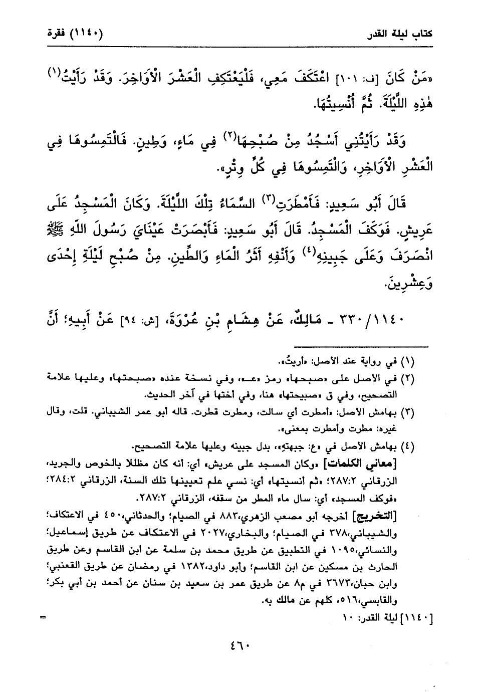 ١١٤٠/ ٣٣٠ - مَالِكٌ، عَنْ هِشَامِ بْنِ عُرْوَةَ، [ش: ٩٤] عَنْ أَبِيهِ؛ أَنَّ ⦗٤٦١⦘ رَسُولَ اللَهِ صلى الله عليه وسلم قَالَ: «تَحَرَّوْا لَيْلَةَ الْقَدْرِ فِي الْعَشْرِ الْأَوَاخِرِ مِنْ رَمَضَانَ».