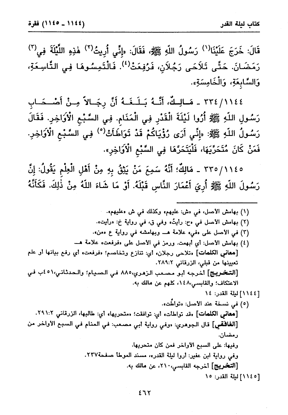 ١١٤٥/ ٣٣٥ - مَالِكٌ؛ أَنَّهُ سَمِعَ مَنْ يَثِقُ بِهِ مِنْ أَهْلِ الْعِلْمِ يَقُولُ: إِنَّ رَسُولَ اللهِ صلى الله عليه وسلم أُرِيَ أَعْمَارَ النَّاسِ قَبْلَهُ. أَوْ مَا شَاءَ اللهُ مِنْ ذلِكَ. فَكَأَنَّهُ ⦗٤٦٣⦘ تَقَاصَرَ (١) أَعْمَارَ أُمَّتِهِ أَنْ لَا يَبْلُغُوا مِنَ الْعَمَلِ، مِثْلَ الَّذِي بَلَغَ غَيْرُهُمْ فِي طُولِ الْعُمْرِ (٢)، فَأَعْطَاهُ اللهُ لَيْلَةَ الْقَدْرِ، خَيْرٌ مِنْ أَلْفِ شَهْرٍ (٣).