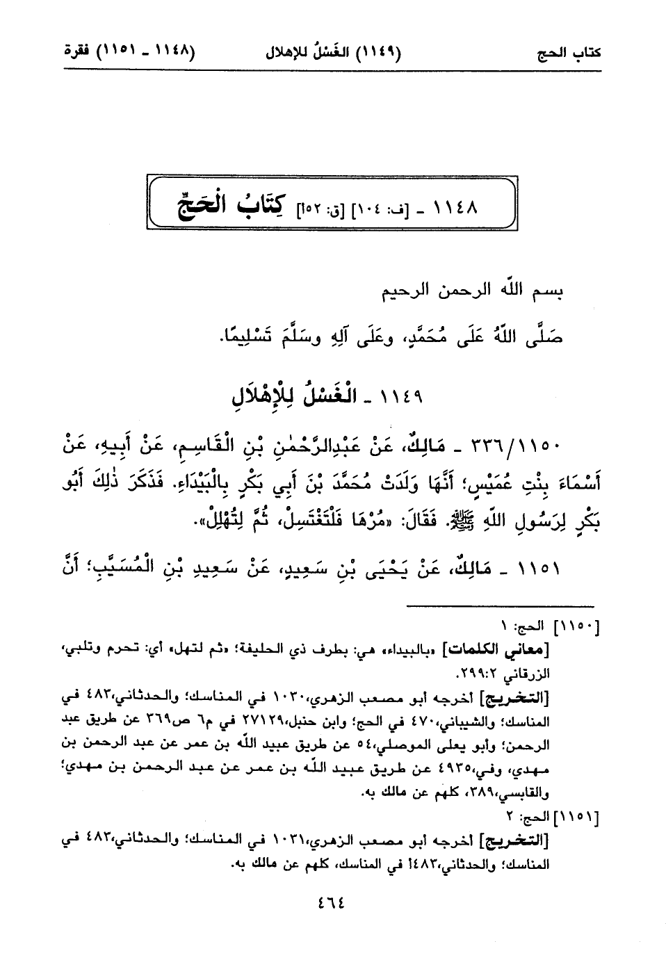 ١١٥١ - مَالِكٌ، عَنْ يَحْيَى بْنِ سَعِيدٍ، عَنْ سَعِيدِ بْنِ الْمُسَيَّبِ؛ أَنَّ ⦗٤٦٥⦘ أَسْمَاءَ بِنْتَ عُمَيْسٍ [ف: ١٠٥] وَلَدَتْ مُحَمَّدَ بْنَ أَبِي بَكْرٍ بِذِي الْحُلَيْفَةِ. فَأَمَرَهَا أَبُو بَكْرٍ أَنْ تَغْتَسِلَ، ثُمَّ تُهِلَّ.