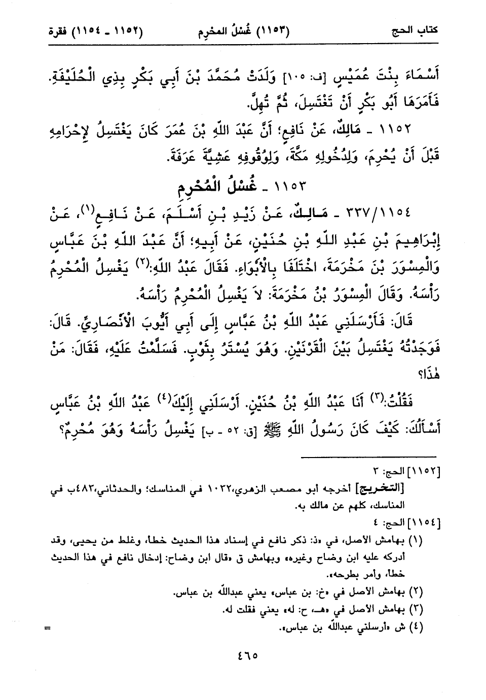 ١١٥٤/ ٣٣٧ - مَالِكٌ، عَنْ زَيْدِ بْنِ أَسْلَمَ، عَنْ نَافِعٍ (١)، عَنْ إِبْرَاهِيمَ بْنِ عَبْدِ اللهِ بْنِ حُنَيْنٍ، عَنْ أَبِيهِ؛ أَنَّ عَبْدَ اللهِ بْنَ عَبَّاسٍ وَالْمِسْوَرَ بْنَ مَخْرَمَةَ، اخْتَلَفَا بِالْأَبْوَاءِ. فَقَالَ عَبْدُ اللهِ: (٢) يَغْسِلُ الْمُحْرِمُ رَأْسَهُ. وَقَالَ الْمِسْوَرُ بْنُ مَخْرَمَةَ: لَا يَغْسِلُ الْمُحْرِمُ رَأْسَهُ.