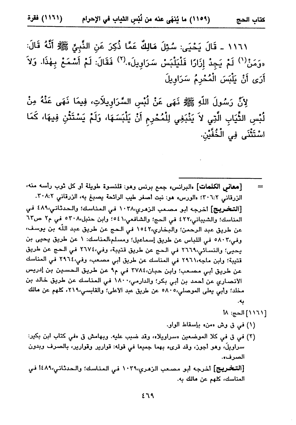 ١١٦١ - قَالَ يَحْيَى: سُئِلَ مَالِكٌ عَمَّا ذُكِرَ عَنِ النَّبِيِّ صلى الله عليه وسلم أَنَّهُ قَالَ: «وَمَنْ (١) لَمْ يَجِدْ إِزَاراً فَلْيَلْبَسْ سَرَاوِيلَ». (٢) فَقَالَ: لَمْ أَسْمَعْ بِهذَا. وَلَا أَرَى أَنْ يَلْبَسَ الْمُحْرِمُ سَرَاوِيلَ لِأَنَّ رَسُولَ اللهِ صلى الله عليه وسلم نَهَى عَنْ لُبْسِ السَّرَاوِيلَاتِ، فِيمَا نَهَى عَنْهُ مِنْ لُبْسِ الثِّيَابِ الَّتِي لَا يَنْبَغِي لِلْمُحْرِمِ أَنْ يَلْبَسَهَا، وَلَمْ يَسْتَثْنِ فِيهَا، كَمَا اسْتَثْنَى فِي الْخُفَّيْنِ.
