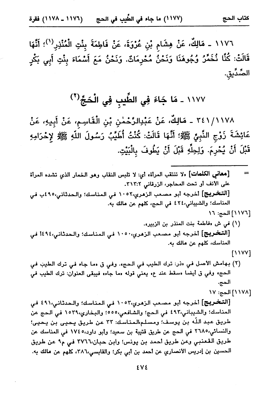 ١١٧٨/ ٣٤١ - مَالِكٌ، عَنْ عَبْدِ الرَّحْمنِ بْنِ الْقَاسِمِ، عَنْ أَبِيهِ، عَنْ عَائِشَةَ زَوْجِ النَّبِيِّ صلى الله عليه وسلم؛ أَنَّهَا قَالَتْ: كُنْتُ أُطَيِّبُ رَسُولَ اللهِ صلى الله عليه وسلم لِإِحْرَامِهِ قَبْلَ أَنْ يُحْرِمَ. وَلِحِلِّهِ قَبْلَ أَنْ يَطُوفَ بِالْبَيْتِ.