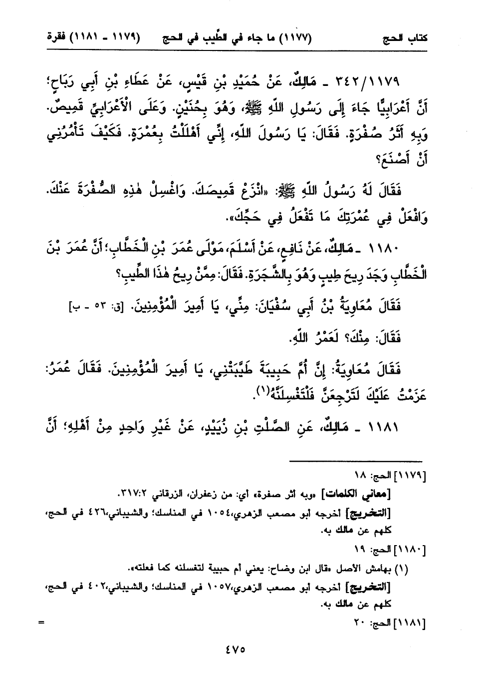 ١١٧٩/ ٣٤٢ - مَالِكٌ، عَنْ حُمَيْدِ بْنِ قَيْسٍ، عَنْ عَطَاءِ بْنِ أَبِي رَبَاحٍ؛ أَنَّ أَعْرَابِيّاً جَاءَ إِلَى رَسُولِ اللهِ صلى الله عليه وسلم، وَهُوَ بِحُنَيْنٍ. وَعَلَى الْأَعْرَابِيِّ قَمِيصٌ. وَبِهِ أَثَرُ صُفْرَةٍ. فَقَالَ: يَا رَسُولَ اللهِ، إِنِّي أَهْلَلْتُ بِعُمْرَةٍ. فَكَيْفَ تَأْمُرُنِي أَنْ أَصْنَعَ؟