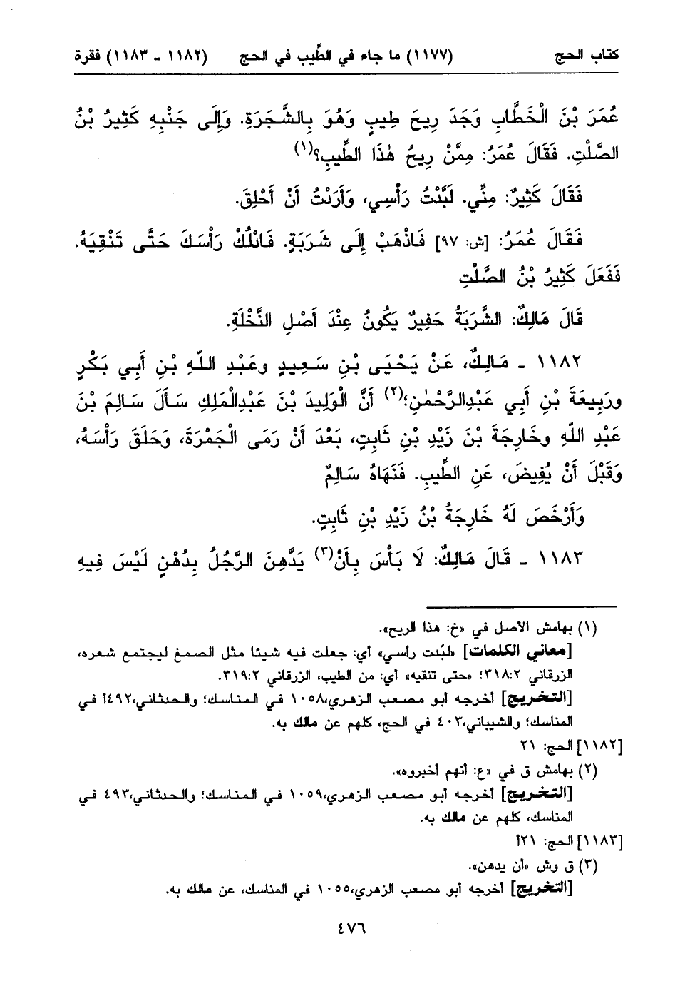 ١١٨٢ - مَالِكٌ، عَنْ يَحْيَى بْنِ سَعِيدٍ وعَبْدِ اللهِ بْنِ أَبِي بَكْرٍ ورَبِيعَةَ بْنِ أَبِي عَبْدِ الرَّحْمنِ؛ (١) أَنَّ الْوَلِيدَ بْنَ عَبْدِ الْمَلِكِ سَأَلَ سَالِمَ بْنَ عَبْدِ اللهِ وخَارِجَةَ بْنَ زَيْدِ بْنِ ثَابِتٍ، بَعْدَ أَنْ رَمَى الْجَمْرَةَ، وَحَلَقَ رَأْسَهُ، وَقَبْلَ أَنْ يُفِيضَ، عَنِ الطِّيبِ. فَنَهَاهُ سَالِمٌ وَأَرْخَصَ لَهُ خَارِجَةُ بْنُ زَيْدِ بْنِ ثَابِتٍ.