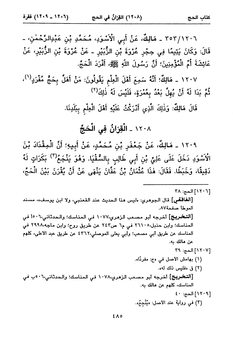 ١٢٠٩ - مَالِكٌ، عَنْ جَعْفَرِ بْنِ مُحَمَّدٍ، عَنْ أَبِيهِ؛ أَنَّ الْمِقْدَادَ بْنَ الْأَسْوَدِ دَخَلَ عَلَى عَلِيِّ بْنِ أَبِي طَالِبٍ بِالسُّقْيَا. وَهُوَ يَنْجَعُ (١) بَكَرَاتٍ لَهُ دَقِيقاً، وَخَبَطاً. فَقَالَ: هذَا عُثْمَانُ بْنُ عَفَّانَ يَنْهَى عَنْ أَنْ يُقْرَنَ بَيْنَ الْحَجِّ، ⦗٤٨٦⦘ وَالْعُمْرَةِ. فَخَرَجَ عَلِيٌّ، وَعَلَى يَدَيْهِ أَثَرُ الدَّقِيقِ، وَالْخَبَطِ. فَمَا أَنْسَى أَثَرَ الدَّقِيقِ، وَالْخَبَطِ (٢) عَلَى ذِرَاعَيْهِ، حَتَّى دَخَلَ عَلَى عُثْمَانَ بْنِ عَفَّانَ. فَقَالَ: أَنْتَ تَنْهَى عَنْ أَنْ يُقْرَنَ بَيْنَ الْحَجِّ، وَالْعُمْرَةِ؟