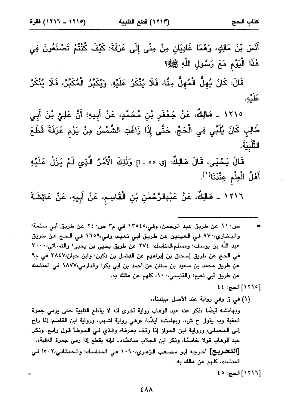 ١٢١٥ - مَالِكٌ، عَنْ جَعْفَرِ بْنِ مُحَمَّدٍ، عَنْ أَبِيهِ؛ أَنَّ عَلِيَّ بْنَ أَبِي طَالِبٍ كَانَ يُلَبِّي فِي الْحَجِّ. حَتَّى إِذَا زَاغَتِ الشَّمْسُ مِنْ يَوْمِ عَرَفَةَ قَطَعَ التَّلْبِيَةَ.