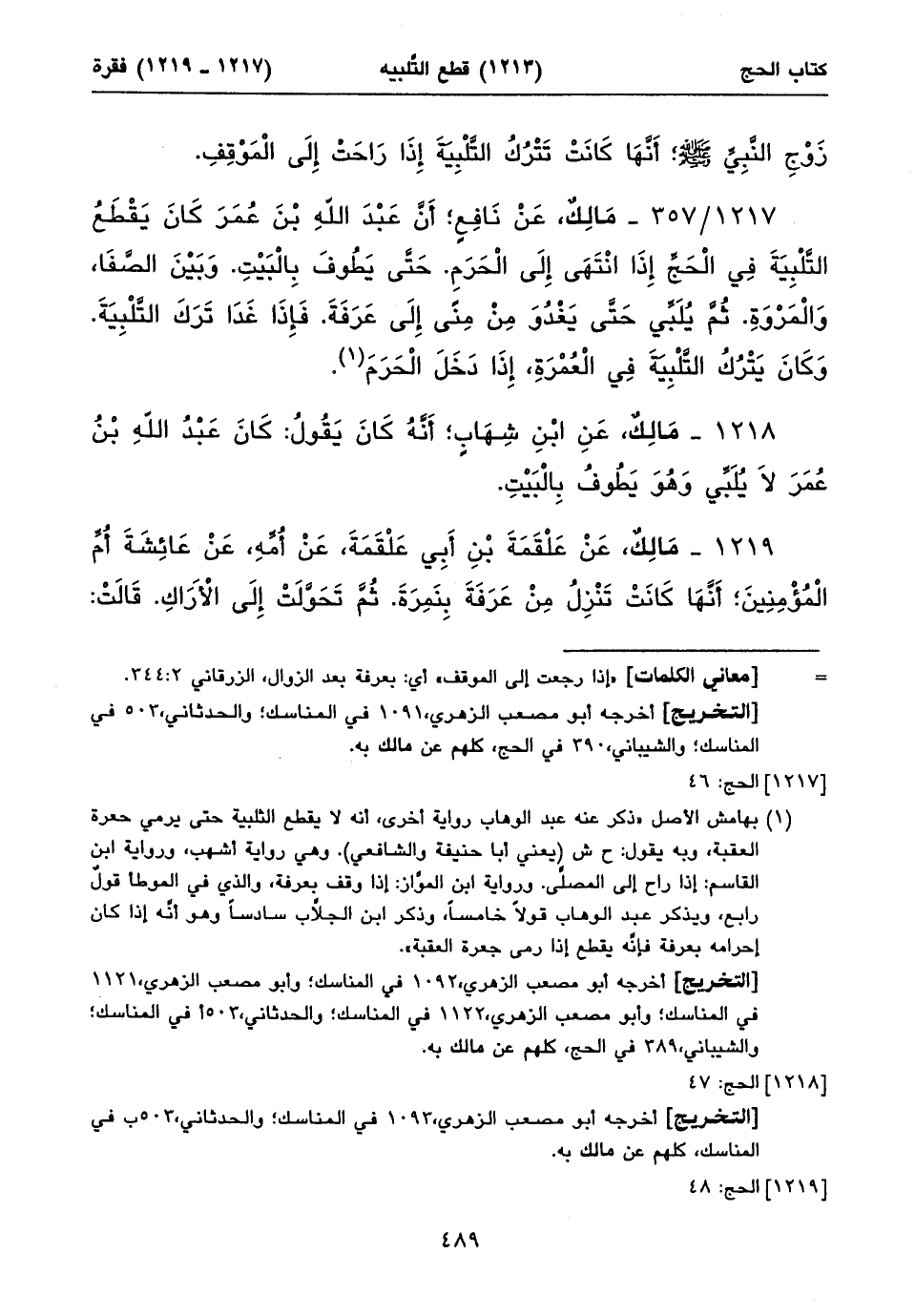 ١٢١٧/ ٣٥٧ - مَالِكٌ، عَنْ نَافِعٍ؛ أَنَّ عَبْدَ اللهِ بْنَ عُمَرَ كَانَ يَقْطَعُ التَّلْبِيَةَ فِي الْحَجِّ إِذَا انْتَهَى إِلَى الْحَرَمِ. حَتَّى يَطُوفَ بِالْبَيْتِ. وَبَيْنَ الصَّفَا، وَالْمَرْوَةِ. ثُمَّ يُلَبِّي حَتَّى يَغْدُوَ مِنْ مِنًى إِلَى عَرَفَةَ. فَإِذَا غَدَا تَرَكَ التَّلْبِيَةَ. وَكَانَ يَتْرُكُ التَّلْبِيَةَ فِي الْعُمْرَةِ، إِذَا دَخَلَ الْحَرَمَ (١).