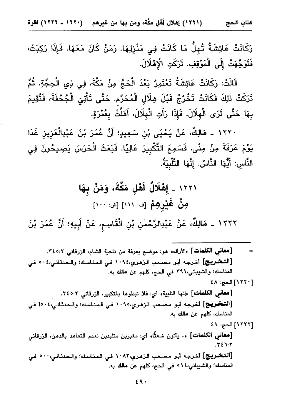 ١٢٢٠ - مَالِكٌ، عَنْ يَحْيَى بْنِ سَعِيدٍ؛ أَنَّ عُمَرَ بْنَ عَبْدِ الْعَزِيزِ غَدَا يَوْمَ عَرَفَةَ مِنْ مِنًى. فَسَمِعَ التَّكْبِيرَ عَالِياً. فَبَعَثَ الْحَرَسَ يَصِيحُونَ فِي النَّاسِ: أَيُّهَا النَّاسُ. إِنَّهَا التَّلْبِيَةُ.