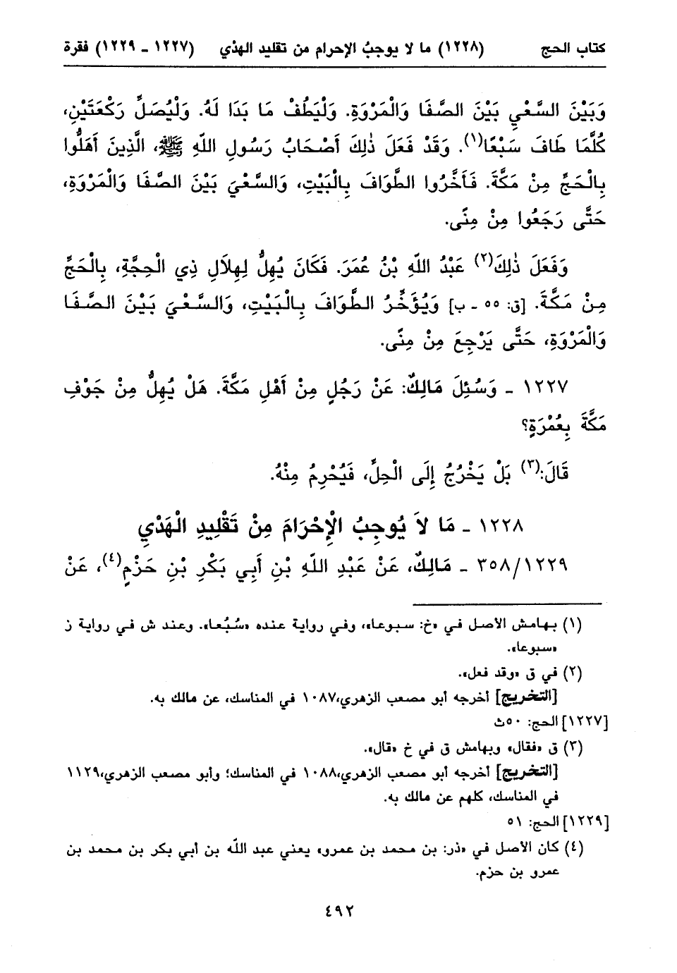 ١٢٢٩/ ٣٥٨ - مَالِكٌ، عَنْ عَبْدِ اللهِ بْنِ أَبِي بَكْرِ بْنِ حَزْمٍ (١)، عَنْ ⦗٤٩٣⦘ عَمْرَةَ بِنْتِ عَبْدِ الرَّحْمنِ؛ أَنَّهَا أَخْبَرَتْهُ: أَنَّ زِيَادَ بْنَ أَبِي سُفْيَانَ، كَتَبَ إِلَى عَائِشَةَ زَوْجِ النَّبِيِّ صلى الله عليه وسلم: أَنَّ عَبْدَ اللهِ بْنَ عَبَّاسٍ قَالَ: مَنْ أَهْدَى هَدْياً حَرُمَ عَلَيْهِ مَا يَحْرُمُ عَلَى الْحَاجِّ، حَتَّى يُنْحَرَ الْهَدْيُ. وَقَدْ بَعَثْتُ بِهَدْيٍ. فَاكْتُبِي إِلَيَّ بِأَمْرِكِ. أَوْ مُرِي صَاحِبَ الْهَدْيِ.