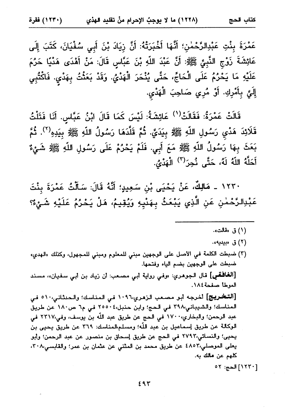 ١٢٣٠ - مَالِكٌ، عَنْ يَحْيَى بْنِ سَعِيدٍ؛ أَنَّهُ قَالَ: سَأَلْتُ عَمْرَةَ بِنْتَ عَبْدِ الرَّحْمنِ عَنِ الَّذِي يَبْعَثُ بِهَدْيِهِ وَيُقِيمُ، هَلْ يَحْرُمُ عَلَيْهِ شَيْءٌ؟ ⦗٤٩٤⦘ فَأَخْبَرَتْنِي أَنَّهَا سَمِعَتْ عَائِشَةَ تَقُولُ: لَا يَحْرُمُ إِلَاّ مَنْ أَهَلَّ، وَلَبَّى (١).